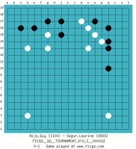 Last move : 0-1 2009 December 18 7:50:52 [Event "FICGS__GO__TOURNAMENT_KYU_I__000022"] [Site "FICGS"] [Date "2009.10.31"] [Round "1"] [Black "Nijs,Guy"] [White "Segur,Laurine"] [Result "0-1"] [Rating 1 "1100"] [Rating 2 "0833"] 1.q16 d3 2.c16 q3 3.j17 n16 4.o17 o15 5.q14 p14 6.q13 m17 7.j15 n13 8.q10 d13 9.e16 g15 10.g17 g13 0-1 This go game has been lost on time (started : 2009.10.31 20:50:16) Here are the names of the openings (joseki) played in the four corners : Corner q16 : q16 n16 Hoshi (Hwajeom, Seongjeom, Xingwei`) 4-4 Point. The star or hoshi (4-4) point, emphasizing influence at the potential expense of territory. Nikken Takagakari (Dukan Nop'dakeolch'im, E`r Gaojia, 2-Space High Approach). White 2 is a light approach move. Rarely played in even games, White 2 is typically employed in handicap games. Black continues with 6-4 or 3-10. In Korean Sunjang Baduk Black has a stone on 8-4. Corner d4 : d3 0-1 Komoku (Somok, Xiao~mu`) 3-4 Point. The komoku (3-4) point is the traditional corner enclosure move.. Player White won this Go (weiqi, baduk) game. Follow this game move after move (download)A meijin needs no joseki. (Anonymous) At work, the authority of a person is inversely proportional to the number of pens that person is carrying. (Dan Rotaru)