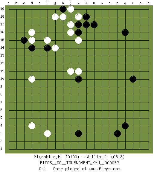 Last move : 0-1 2009 December 24 7:57:23 [Event "FICGS__GO__TOURNAMENT_KYU__000092"] [Site "FICGS"] [Date "2009.10.31"] [Round "1"] [Black "Miyashita,Hiroyuki"] [White "Willis,Jonathan"] [Result "0-1"] [Rating 1 "0100"] [Rating 2 "0313"] 1.q16 d4 2.q4 d16 3.r10 f3 4.k3 d10 5.p3 j16 6.m17 j11 7.k10 k11 8.k16 k15 9.k17 j17 10.j18 h18 11.h19 k18 12.l18 j19 13.l17 g18 14.c15 d15 15.d14 f15 16.f14 g14 0-1 This go game has been lost on time (started : 2009.10.31 20:50:36) Here are the names of the openings (joseki) played in the four corners : Player White won this Go (weiqi, baduk) game. Follow this game move after move (download)When your opponent is thick, you must also become thick. (Otake Hideo, 9p) Gambling is the son of avarice and the father of despair. (French proverb)