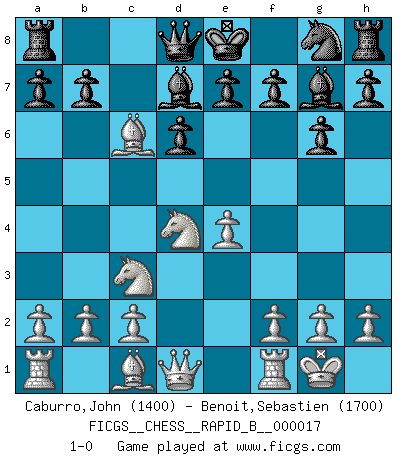 Last move : 1-0 2006 November 9 3:49:48 [Event "FICGS__CHESS__RAPID_B__000017"] [Site "FICGS"] [Date "2006.10.01"] [Round "1"] [White "Caburro,John"] [Black "Benoit,Sebastien"] [Result "1-0"] [WhiteElo "1400"] [BlackElo "1700"] 1.e4 c5 2.Nf3 d6 3.Nc3 Nc6 4.Bb5 Bd7 5.O-O g6 6.d4 cxd4 7.Nxd4 Bg7 8.Bxc6 1-0 This chess game has been lost on time (started : 2006.10.01 13:8:11) Sicilian Kingside Castling by player White (move 5) Player White won this chess game. Follow this game move after move (download)Man is a frivolous, a specious creature, and like a Chess player, cares more for the process of attaining his goal than for the goal itself. (Dostoyevsky) Es ist schade, dass viele Schachsportler vergessen, wie wichtig Auftreten und angemessene Kleidung sind. (Alexandra Kosteniuk) El Ajedrez es un regaderazo frío para la mente. (Sir John Simon) On a dit que l'homme se distingue de l'animal par le fait qu'il achète plus de livres qu'il ne peut en lire. Je voudrais suggérer qu'inclure à la liste des livres quelques livres d'échecs rendrait la distinction manifeste. (Edward Lasker) To steal ideas from one person is plagiarism. To steal from many is research. (Unknown)