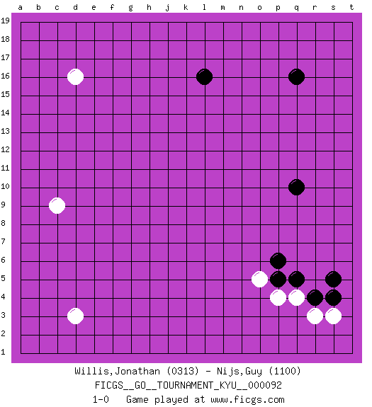 Last move : 1-0 2009 December 15 20:40:51 [Event "FICGS__GO__TOURNAMENT_KYU__000092"] [Site "FICGS"] [Date "2009.10.31"] [Round "1"] [Black "Willis,Jonathan"] [White "Nijs,Guy"] [Result "1-0"] [Rating 1 "0313"] [Rating 2 "1100"] 1.q16 d16 2.r4 d3 3.l16 c9 4.q10 p4 5.p5 o5 6.p6 q4 7.q5 r3 8.s5 s3 9.s4 1-0 This go game has been lost on time (started : 2009.10.31 20:50:36) Here are the names of the openings (joseki) played in the four corners : Corner q4 : r4 p4 Komoku (Somok, Xiao~mu`) 3-4 Point. The komoku (3-4) point is the traditional corner enclosure move.. Ikken Takagakari (Hankan Nop'dakeolch'im, Yi Gaogua`jiao~, 1-Space High Approach). The 5-4 approach move has become more popular in modern times, as modern Go emphasizes speed and influence. Player Black won this Go (weiqi, baduk) game. Follow this game move after move (download)To reduce an opponent's large prospective territory, strike at the shoulder. (Anonymous) Perseverance does not equal worthiness. Next time you want to get my attention, wear something fun. Low-riding jeans are hot. (Gregory House, House M.D.)