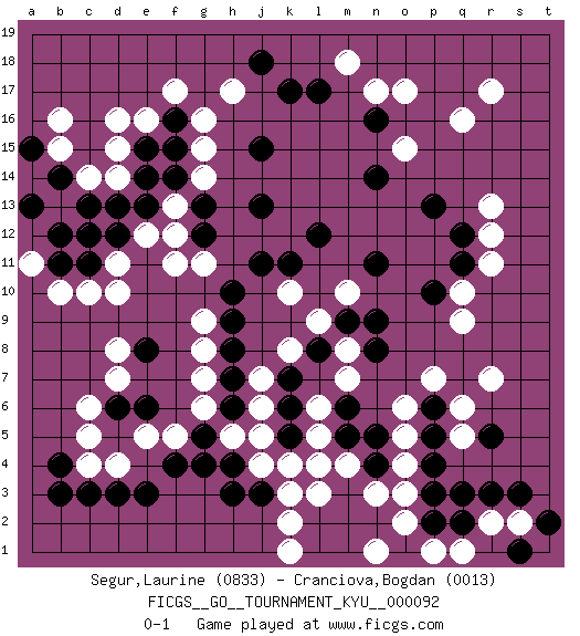 Last move : 0-1 2010 March 9 11:40:1 [Event "FICGS__GO__TOURNAMENT_KYU__000092"] [Site "FICGS"] [Date "2009.10.31"] [Round "1"] [Black "Segur,Laurine"] [White "Cranciova,Bogdan"] [Result "0-1"] [Rating 1 "0833"] [Rating 2 "0013"] 1.d3 q16 2.q3 d16 3.n16 o17 4.k17 h17 5.j15 k4 6.h4 o3 7.m5 m4 8.k5 q10 9.p13 r13 10.q12 r12 11.r5 r7 12.q11 r11 13.p10 q9 14.n11 d10 15.e13 d14 16.d12 d7 17.e8 d8 18.e6 c5 19.d6 c6 20.b11 b10 21.j3 k3 22.n4 n3 23.m3 l4 24.l2 k2 25.p3 m2 26.n2 o2 27.m1 o4 28.o1 p1 29.p2 n1 30.l1 k1 31.o1 q1 32.m2 f17 33.n5 r2 34.p4 o5 35.p6 o6 36.n8 l5 37.m6 l6 38.l8 m7 39.e15 d15 40.f16 e16 41.f15 g16 42.b4 c4 43.b3 g15 44.f14 g14 45.g12 f13 46.e14 e12 47.d13 f12 48.c13 c14 49.b14 d11 50.c11 b13 51.c12 c10 52.a13 a11 53.b12 b15 54.a15 b16 55.g13 f11 56.j11 g11 57.j13 p7 58.q2 n1 59.r3 s2 60.s3 q5 61.p5 l3 62.t2 q6 63.s1 j7 64.h6 d4 65.e3 j5 66.k6 j6 67.k7 j4 68.h3 h5 69.g5 g6 70.h7 g7 71.h8 g8 72.h9 g9 73.h10 m8 74.m9 k8 75.c3 f5 76.f4 e5 77.g4 l9 78.l12 m10 79.n9 k10 80.k11 o15 81.n14 r17 82.j18 m18 83.l17 n17 0-1 Here are the names of the openings (joseki) played in the four corners : Corner q16 : q16 n16 Hoshi (Hwajeom, Seongjeom, Xingwei`) 4-4 Point. The star or hoshi (4-4) point, emphasizing influence at the potential expense of territory. Niken Takagakari (Dukan Nop'dakeolch'im, E`r Gaojia, 2-Space High Approach). Black 2 is a light approach move. Rarely played in even games, Black 2 is typically employed in handicap games. White continues with 6-4 or 3-10. In Korean Sunjang Baduk White has a stone on 8-4. Corner q4 : q3 o3 Komoku (Somok, Xiao~mu`) 3-4 Point. The komoku (3-4) point is the traditional corner enclosure move.. Player White won this Go (weiqi, baduk) game. Follow this game move after move (download)You don't have to be really good anymore to get good results. What's happening with chess is that it's gradually losing its place as the par excellence of intellectual activity. Smart people in search of a challenging board game might try a game called Go. (Hans Berliner, The New York Times, 2003) A specialist learns more and more about less and less until he knows everything about nothing. (Nicholas Murray Butler)