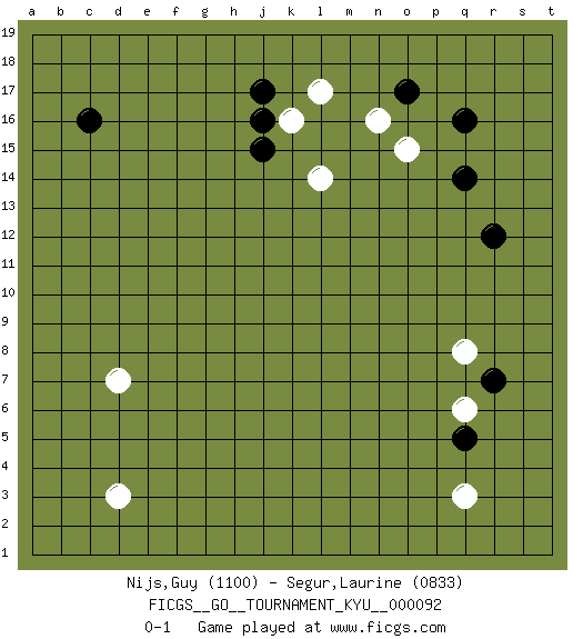 Last move : 0-1 2009 December 17 19:50:15 [Event "FICGS__GO__TOURNAMENT_KYU__000092 "] [Site "FICGS"] [Date "2009.10.31"] [Round "1"] [Black "Nijs,Guy "] [White "Segur,Laurine "] [Result "0-1"] [Rating 1 "1100"] [Rating 2 "0833"] 1.q16 d3 2.c16 q3 3.j17 n16 4.o17 l17 5.j15 k16 6.j16 l14 7.q14 o15 8.r12 d7 9.q5 q8 10.r7 q6 0-1 This go game has been lost on time (started : 2009.10.31 20:50:36) Here are the names of the openings (joseki) played in the four corners : Corner q16 : q16 n16Hoshi (Hwajeom, Seongjeom, Xingwei`) 4-4 Point. The star or hoshi (4-4) point, emphasizing influence at the potential expense of territory.Nikken Takagakari (Dukan Nop'dakeolch'im, E`r Gaojia, 2-Space High Approach). White 2 is a light approach move. Rarely played in even games, White 2 is typically employed in handicap games. Black continues with 6-4 or 3-10. In Korean Sunjang Baduk Black has a stone on 8-4. Corner q4 : q3 q5Komoku (Somok, Xiao~mu`) 3-4 Point. The komoku (3-4) point is the traditional corner enclosure move..Ikken Takagakari (Hankan Nop'dakeolch'im, Yi Gaogua`jiao~, 1-Space High Approach). The 5-4 approach move has become more popular in modern times, as modern Go emphasizes speed and influence. Player White won this Go (weiqi, baduk) game.Follow this game move after move (download ) In opponents' sphere of influence, avoid sharp conflict, don't move too deep. (Otake Hideo, 9p) Mac users swear by their computers. PC users swear at their computers. (Author unknown)