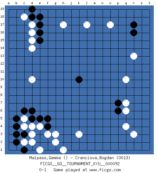 Last move : 0-1 2010 January 1 20:20:17 [Event "FICGS__GO__TOURNAMENT_KYU__000092"] [Site "FICGS"] [Date "2009.10.31"] [Round "1"] [Black "Malpass,Gemma"] [White "Cranciova,Bogdan"] [Result "0-1"] [Rating 2 "0013"] 1.r16 d4 2.k10 q4 3.d5 c4 4.e5 e4 5.p6 q6 6.f5 d16 7.p7 q7 8.f4 c5 9.d6 d10 10.c6 c2 11.e16 d17 12.e17 d14 13.e15 d15 14.d18 c18 15.e18 l17 16.d19 k3 17.r17 o17 18.e3 d3 19.b5 f3 20.e2 g3 21.f2 g2 22.b4 d2 23.g1 h17 24.f1 h1 25.b3 q10 26.c3 r3 27.b2 r13 28.c1 e1 0-1 This go game has been lost on time (started : 2009.10.31 20:50:36) Here are the names of the openings (joseki) played in the four corners : Corner d4 : d4 d5 Hoshi (Hwajeom, Seongjeom, Xingwei`) 4-4 Point. The star or hoshi (4-4) point, emphasizing influence at the potential expense of territory. Corner q4 : q4 p6 Hoshi (Hwajeom, Seongjeom, Xingwei`) 4-4 Point. The star or hoshi (4-4) point, emphasizing influence at the potential expense of territory. Corner d16 : d16 e16 Hoshi (Hwajeom, Seongjeom, Xingwei`) 4-4 Point. The star or hoshi (4-4) point, emphasizing influence at the potential expense of territory. Corner q16 : r16 l17 Komoku (Somok, Xiao~mu`) 3-4 Point. The komoku (3-4) point is the traditional corner enclosure move.. Player White won this Go (weiqi, baduk) game. Follow this game move after move (download)The weak player fears ko, the strong player seeks it. (Bill Taylor) To err is human, but to really foul things up requires a computer. (Farmer's Almanac, 1978)