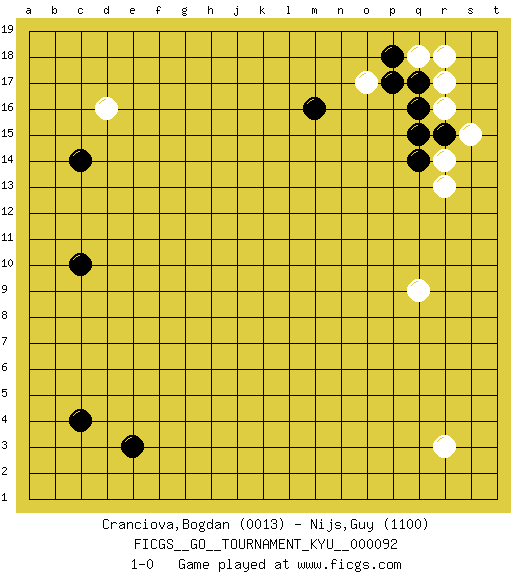 Last move : 1-0 2009 December 15 8:39:31 [Event "FICGS__GO__TOURNAMENT_KYU__000092"] [Site "FICGS"] [Date "2009.10.31"] [Round "1"] [Black "Cranciova,Bogdan"] [White "Nijs,Guy"] [Result "1-0"] [Rating 1 "0013"] [Rating 2 "1100"] 1.q16 d16 2.c4 r3 3.e3 o17 4.m16 r17 5.q17 r16 6.r15 r14 7.q14 s15 8.q15 q18 9.p18 r18 10.p17 r13 11.c10 q9 12.c14 1-0 This go game has been lost on time (started : 2009.10.31 20:50:36) Here are the names of the openings (joseki) played in the four corners : Corner q16 : q16 o17 Hoshi (Hwajeom, Seongjeom, Xingwei`) 4-4 Point. The star or hoshi (4-4) point, emphasizing influence at the potential expense of territory. Ikken Kakari (Hankan Keolch'im, Yi Gua`jiao~, 1-Space Low Approach). White 2 is the standard approach move to the 4-4. Corner d16 : d16 c14 Hoshi (Hwajeom, Seongjeom, Xingwei`) 4-4 Point. The star or hoshi (4-4) point, emphasizing influence at the potential expense of territory. Ikken Kakari (Hankan Keolch'im, Yi Gua`jiao~, 1-Space Low Approach). Black 2 is the standard approach move to the 4-4. Player Black won this Go (weiqi, baduk) game. Follow this game move after move (download)Very few good moves are played. (Pierre Audouard) Inventor: A person who makes an ingenious arrangement of wheels, levers and springs, and believes it civilization. (Ambrose Bierce, The Devil's Dictionary)