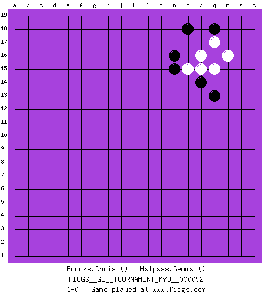 Last move : 1-0 2009 December 27 20:7:7 [Event "FICGS__GO__TOURNAMENT_KYU__000092"] [Site "FICGS"] [Date "2009.10.31"] [Round "1"] [Black "Brooks,Chris"] [White "Malpass,Gemma"] [Result "1-0"] 1.q16 p16 2.p14 p15 3.q13 q15 4.q18 q17 5.o18 r16 6.n16 o15 7.n15 1-0 This go game has been lost on time (started : 2009.10.31 20:50:36) Here are the names of the openings (joseki) played in the four corners : Corner q16 : q16 p16 Hoshi (Hwajeom, Seongjeom, Xingwei`) 4-4 Point. The star or hoshi (4-4) point, emphasizing influence at the potential expense of territory. Player Black won this Go (weiqi, baduk) game. Follow this game move after move (download)Strange things happen at the one-two points. (Anonymous) Horse racing is animated roulette. (Roger Kahn)
