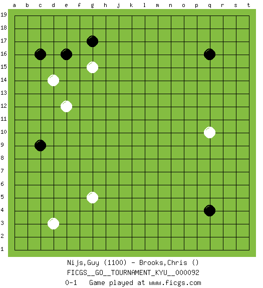 Last move : 0-1 2009 December 25 7:59:15 [Event "FICGS__GO__TOURNAMENT_KYU__000092"] [Site "FICGS"] [Date "2009.10.31"] [Round "1"] [Black "Nijs,Guy"] [White "Brooks,Chris"] [Result "0-1"] [Rating 1 "1100"] 1.q16 d3 2.c16 g5 3.q4 d14 4.e16 e12 5.g17 q10 6.c9 g15 0-1 This go game has been lost on time (started : 2009.10.31 20:50:36) Here are the names of the openings (joseki) played in the four corners : Corner d16 : c16 d14 Komoku (Somok, Xiao~mu`) 3-4 Point. The komoku (3-4) point is the traditional corner enclosure move.. Player White won this Go (weiqi, baduk) game. Follow this game move after move (download)Don't overlook the edge of the board. (Anonymous) He is a liar. I just don't know what the lie is yet. (Horatio Caine, C.S.I. Miami)