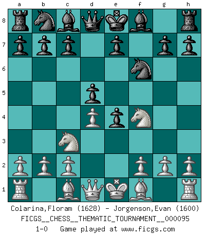 Last move : 1-0 2009 December 13 8:33:46 [Event "FICGS__CHESS__THEMATIC_TOURNAMENT__000095"] [Site "FICGS"] [Date "2009.10.31"] [Round "1"] [White "Colarina,Floram"] [Black "Jorgenson,Evan"] [Result "1-0"] [WhiteElo "1628"] [BlackElo "1600"] 1.d4 f5 2.e4 fxe4 3.Nc3 d5 4.Nge2 Nf6 5.Nf4 1-0 This chess game has been lost on time (started : 2009.10.31 22:28:13) Dutch : Staunton gambit Player White won this chess game. Follow this game move after move (download)The defensive power of a pinned piece is only imaginary. (Aaron Nimzovich) Frage: Wie viele Autos haben Sie schon zerstört? - Antwort: Nur zwei. (Loek van Wely) Bobby Fischer es el mas grande genio de Ajedrez de todos los tiempos. (Alexander Kotov) Soyez une menace à chaque fois que vous vous asseyez pour jouer. (Ken Smith) Memory is a crazy woman that hoards colored rags and throws away food. (Austin O'Malley)