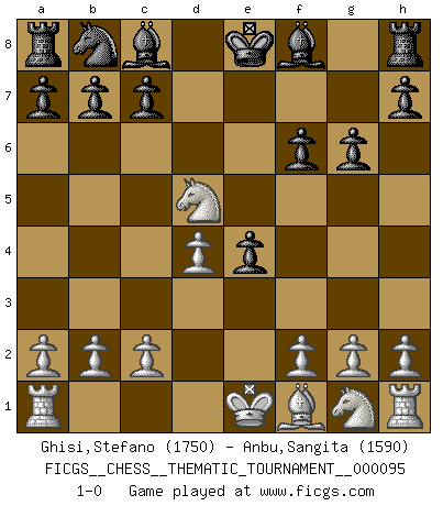 Last move : 1-0 2009 November 6 3:40:11 [Event "FICGS__CHESS__THEMATIC_TOURNAMENT__000095"] [Site "FICGS"] [Date "2009.10.31"] [Round "1"] [White "Ghisi,Stefano"] [Black "Anbu,Sangita"] [Result "1-0"] [WhiteElo "1750"] [BlackElo "1590"] 1.d4 f5 2.e4 fxe4 3.Nc3 Nf6 4.Bg5 d5 5.Bxf6 exf6 6.Qh5+ g6 7.Qxd5 Qxd5 8.Nxd5 1-0 Dutch : Staunton gambit, Staunton's line Player White won this chess game. Follow this game move after move (download)It is no time to be playing Chess when the house is on fire. (Italian Proverb) Die Partien sind immer verschieden, die Interviews immer die gleichen. (Garry Kasparov) Solo el jugador con la iniciativa tiene el derecho a atacar. (Wilhelm Steinitz) Ce qui caractérise les parties de combat, c'est que si le défenseur a constamment de difficiles problèmes à résoudre, l'attaquant doit chercher sans relâche de nouvelles possibilités d'attaque. (Koblentz) The large trees attract high winds. (Chinese proverb)