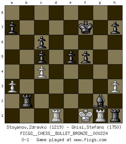 Last move : 0-1 2009 October 31 23:9:53 [Event "FICGS__CHESS__BULLET_BRONZE__000224"] [Site "FICGS"] [Date "2009.10.31"] [Round "1"] [White "Stoyanov,Zdravko"] [Black "Ghisi,Stefano"] [Result "0-1"] [WhiteElo "1219"] [BlackElo "1750"] 1.e4 c5 2.Nf3 d6 3.h3 Nc6 4.a3 Nf6 5.d3 e5 6.Be2 Be7 7.O-O d5 8.b3 dxe4 9.dxe4 Nxe4 10.Qxd8+ Bxd8 11.Bb2 f6 12.Bc4 Nd6 13.Bd5 Bf5 14.Bxc6+ bxc6 15.c4 Rb8 16.Nbd2 Ba5 17.Rad1 O-O 18.g4 Bd3 19.Rfe1 Nxc4 20.bxc4 Rxb2 21.Re3 Rd8 22.g5 Bc2 23.Ra1 Bxd2 24.Nxd2 Rxd2 25.gxf6 gxf6 26.Rf3 f5 27.Kh2 Be4 28.Re3 Rxf2+ 29.Kg1 Rg2+ 30.Kf1 Rh2 31.Rg3+ Kf7 32.Rd1 Rh1+ 33.Rg1 Bg2+ 0-1 Sicilian Kingside Castling by player White (move 7) Kingside Castling by player Black (move 17) Player Black won this chess game. Follow this game move after move (download)Chess is a fighting game which is purely intellectual and includes chance. (Richard Reti) Wenn es im Universum noch irgendwo intelligente Lebewesen gibt, dann kennen sie Go. (Emanuel Lasker) Jugadores de primera clase pierden en contra de jugadores de segunda clase porque los jugadores de segunda clase a veces juegan una partida de primer clase. (Siegbert Tarrasch) Je ne crois pas en la psychologie, je crois aux bons coups. (Robert Fischer) Men never do evil so completely and cheerfully as when they do it from religious conviction. (Blaise Pascal)