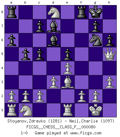 Last move : 1-0 2009 November 10 9:35:36 [Event "FICGS__CHESS__CLASS_F__000080"] [Site "FICGS"] [Date "2009.10.31"] [Round "1"] [White "Stoyanov,Zdravko"] [Black "Neil,Charlie"] [Result "1-0"] [WhiteElo "1281"] [BlackElo "1097"] 1.e4 e5 2.Nf3 Nc6 3.Bb5 a6 4.Bxc6 dxc6 5.h3 Bd6 6.O-O Ne7 7.d3 Ng6 8.Re1 b5 9.Be3 c5 10.Ng5 O-O 11.Qh5 h6 12.Nxf7 Bd7 13.Nxd8 1-0 Ruy Lopez : Exchange variation Kingside Castling by player White (move 6) Kingside Castling by player Black (move 10) Player White won this chess game. Follow this game move after move (download)Morphy was probably the greatest genius of them all. (Bobby Fischer) Schach verlangt totale Konzentration. (Robert James Fischer) En el Ajedrez, tal como es jugado por los Maestros, practicamente la suerte es eliminada. (Emanuel Lasker) Je menace de comprendre la position. (Anonyme) If everyone is thinking alike, then somebody isn't thinking. (US General George S. Patton)