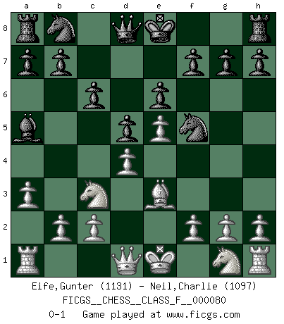 Last move : 0-1 2009 December 13 8:33:46 [Event "FICGS__CHESS__CLASS_F__000080"] [Site "FICGS"] [Date "2009.10.31"] [Round "1"] [White "Eife,Gunter"] [Black "Neil,Charlie"] [Result "0-1"] [WhiteElo "1131"] [BlackElo "1097"] 1.e4 c6 2.d4 d5 3.e5 Bf5 4.Be3 e6 5.Nc3 Bb4 6.a3 Ba5 7.Bd3 Ne7 8.Bxf5 Nxf5 0-1 This chess game has been lost on time (started : 2009.10.31 22:44:8) Caro-Kann : Advance variation Player Black won this chess game. Follow this game move after move (download)Man is a frivolous, a specious creature, and like a Chess player, cares more for the process of attaining his goal than for the goal itself. (Dostoyevsky) Es ist schade, dass viele Schachsportler vergessen, wie wichtig Auftreten und angemessene Kleidung sind. (Alexandra Kosteniuk) El Ajedrez es tan inspirador que yo no creo que un buen jugador sea capaz de tener un pensamiento malo durante una partida. (Wilhelm Steinitz) Il vaut mieux sacrifier les pièces de l'adversaire. (Xavier Tartacover) SEO proverb : Make your website optimized for human beings, not for search engines.