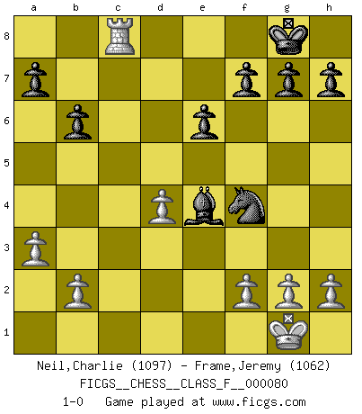 Last move : 1-0 2009 November 16 18:17:45 [Event "FICGS__CHESS__CLASS_F__000080"] [Site "FICGS"] [Date "2009.10.31"] [Round "1"] [White "Neil,Charlie"] [Black "Frame,Jeremy"] [Result "1-0"] [WhiteElo "1097"] [BlackElo "1062"] 1.d4 d5 2.c4 c6 3.cxd5 cxd5 4.Nc3 Nf6 5.Bg5 Nbd7 6.Nf3 e6 7.e4 dxe4 8.Nxe4 Be7 9.Nxf6+ Bxf6 10.Bxf6 Nxf6 11.Bd3 O-O 12.O-O b6 13.Rc1 Bb7 14.Re1 Rc8 15.Ne5 Rxc1 16.Qxc1 Qd5 17.Nf3 Rc8 18.Qb1 Qc6 19.Bf1 Qc2 20.Qxc2 Rxc2 21.Re2 Bxf3 22.Rxc2 Bb7 23.Bd3 Nd5 24.a3 Nf4 25.Be4 Bxe4 26.Rc8+ 1-0 QGD Slav defense : Exchange variation Kingside Castling by player Black (move 11) Kingside Castling by player White (move 12) Player White won this chess game. Follow this game move after move (download)Bobby is the finest Chess player this country ever produced. His memory for the moves, his brilliance in dreaming up combinations, and his fierce determination to win are uncanny. (John Collins) Der Traum, für den ich lebe, ist der von einem freien Russland. Viele mögen sagen: Russland hat doch ein Parlament, einen gewählten Präsidenten. Aber ich spüre, dass in meiner Heimat die Angst wiederkehrt. Eine Angst, sich frei zu äußern, bestimmte Dinge zu tun (Garry Kasparov) Todos los jugadores de Ajedrez deberían tener un pasatiempo. (Savielly Tartakower) Les Echecs mettent en conflit, non pas deux intelligences, mais deux volontés. (Lasker) The existence of forgetting has never been proved: We only know that some things don't come to mind when we want them. (Friedrich Nietzsche)