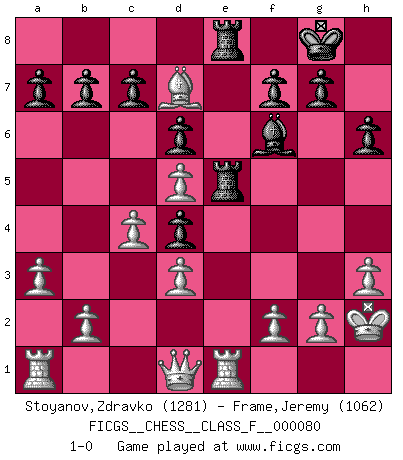 Last move : 1-0 2009 November 13 14:54:51 [Event "FICGS__CHESS__CLASS_F__000080"] [Site "FICGS"] [Date "2009.10.31"] [Round "1"] [White "Stoyanov,Zdravko"] [Black "Frame,Jeremy"] [Result "1-0"] [WhiteElo "1281"] [BlackElo "1062"] 1.e4 e5 2.Nf3 Nf6 3.d3 Nc6 4.Bg5 Be7 5.a3 d6 6.Nc3 Bg4 7.Be2 h6 8.Bxf6 Bxf6 9.h3 Be6 10.O-O O-O 11.Re1 Qd7 12.Kh2 Nd4 13.Nxd4 exd4 14.Nd5 Bxd5 15.exd5 Rfe8 16.c4 Re5 17.Bg4 Rae8 18.Bxd7 1-0 Petrov's defense Kingside Castling by player White (move 10) Kingside Castling by player Black (move 10) Player White won this chess game. Follow this game move after move (download)The most important feature of the Chess position is the activity of the pieces. This is absolutely fundamental in all phases of the game: Opening, Middlegame and especially Endgame. The primary constraint on a piece's activity is the Pawn structure. (Michael Stean) Der vorletzte Fehler gewinnt. (Savielly Grigorievitsch Tartakower) Haz el enroque temprano y seguido. (Rob Sillars) Le temps de noter son nom sur la feuille de partie, j'étais déjà en zeitnot ! D'un modeste amateur apparié lors de la première ronde d'un open contre le grand-maître Azmaïparashvili. Hello Thibault, if I have had a plan (and I had one, I hope), I have forgotten it during the last week... - Hello Heinz-Georg. What do you mean a plan ? (Anonymous players, during a Big Chess game)