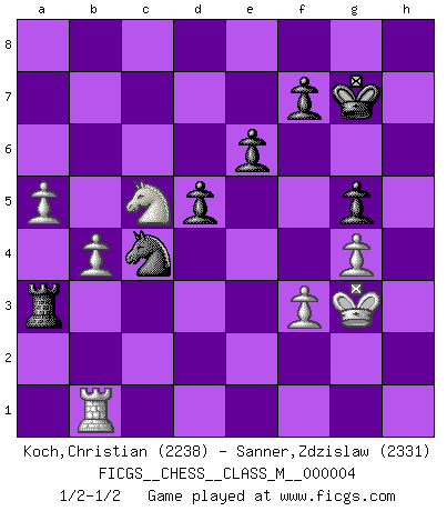Last move : 1/2-1/2 2006 August 24 16:29:40 [Event "FICGS__CHESS__CLASS_M__000004"] [Site "FICGS"] [Date "2006.04.23"] [Round "1"] [White "Koch,Christian"] [Black "Sanner,Zdzislaw"] [Result "1/2-1/2"] [WhiteElo "2238"] [BlackElo "2331"] 1.e4 Nf6 2.e5 Nd5 3.c4 Nb6 4.d4 d6 5.exd6 cxd6 6.Nc3 g6 7.Be3 Bg7 8.Rc1 O-O 9.Nf3 Bg4 10.Be2 Nc6 11.b3 d5 12.c5 Nc8 13.O-O e6 14.Qd2 N8e7 15.Nh4 Bxe2 16.Nxe2 Bf6 17.Nf3 Re8 18.Bf4 Nf5 19.Rfe1 h5 20.Rb1 a5 21.h3 b6 22.Rec1 Rc8 23.g4 hxg4 24.hxg4 Nh4 25.Nxh4 Bxh4 26.Kg2 Bf6 27.f3 Be7 28.cxb6 Bb4 29.Qe3 Qxb6 30.Bg5 Bf8 31.Bf6 Bg7 32.Bxg7 Kxg7 33.Rc5 Rh8 34.Rbc1 Ne7 35.Nf4 Qd6 36.Rxa5 Rxc1 37.Qxc1 Nc6 38.Ra6 Rc8 39.Nd3 Qc7 40.Qc3 Qb7 41.Ra4 Qe7 42.Qd2 Qh4 43.Qf4 g5 44.Qh2 Qxh2 45.Kxh2 Ne7 46.b4 Rc4 47.Ra3 Rxd4 48.Kg3 Nc8 49.Rb3 Nb6 50.Nc5 Rd2 51.a4 Nc4 52.a5 Rc2 53.Nd3 Ra2 54.Rb1 Ra3 55.Nc5 1/2-1/2 Alekhine's defense Kingside Castling by player Black (move 8) Kingside Castling by player White (move 13) This chess game ended in a draw. Follow this game move after move (download)The defensive power of a pinned piece is only imaginary. (Aaron Nimzovich) Je mehr wir mit Computern analysieren, desto mehr glauben wir an Verteidigung. (Vladimir Kramnik) Un entendimiento minucioso de las típicas continuaciones de mate hacen de las mas complicadas combinaciones de sacrificio que conducen hacia ellas no solo no dificiles, sino casi un asunto de rutina. (Siegbert Tarrasch) Je ne suis pas le dernier à jouer lâchement des coups douteux pendant le zeïtnot de l'adversaire pour l'achever: en effet les coups qui font le plus peur sont ceux que l'on ne comprend pas. Je me fais souvent peur quand je joue. (Un professeur anonyme) It is not enough to be a good player... you must also play well. (Siegbert Tarrasch)