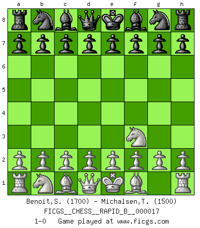 Last move : 1-0 2006 November 3 2:53:13 [Event "FICGS__CHESS__RAPID_B__000017"] [Site "FICGS"] [Date "2006.10.01"] [Round "1"] [White "Benoit,Sebastien"] [Black "Michalsen,Trond"] [Result "1-0"] [WhiteElo "1700"] [BlackElo "1500"] 1.Nf3 1-0 This chess game has been lost on time (started : 2006.10.01 13:8:11) Reti Opening Player White won this chess game. Follow this game move after move (download)A Chess game is divided into three stages: the first, when you hope you have the advantage, the second when you believe you have an advantage, and the third... when you know you're going to lose ! (Savielly Tartakower) In der Schule lernt man nichts. Es ist nur Zeitverschwendung. (Robert James Fischer) Nos gusta pensar. (Gary Kasparov) La vie est comme un jeu d'échecs : nous esquissons un plan, mais celui-ci est tributaire de ce que daignent faire l'adversaire aux échecs et le destin dans la vie. (Arthur Schopenhauer) He who defends everything defends nothing. (Frederick the Great)
