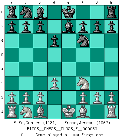 Last move : 0-1 2009 December 12 8:26:2 [Event "FICGS__CHESS__CLASS_F__000080"] [Site "FICGS"] [Date "2009.10.31"] [Round "1"] [White "Eife,Gunter"] [Black "Frame,Jeremy"] [Result "0-1"] [WhiteElo "1131"] [BlackElo "1062"] 1.e4 e5 2.Nf3 Nf6 3.Nxe5 d6 4.Nf3 Nxe4 5.Qe2 Qe7 6.d3 Nf6 7.Qxe7+ Bxe7 0-1 This chess game has been lost on time (started : 2009.10.31 22:44:8) Petrov : Cozio (Lasker) attack Player Black won this chess game. Follow this game move after move (download)Up to this point White has been following well-known analysis. But now he makes a fatal error: he begins to use his own head. (Siegbert Tarrasch) Jeder Fehler erscheint unglaublich dumm, wenn andre ihn begehen. (Georg Christoph Lichtenberg) Un mal día en el Ajedrez, es mejor que cualquier buen día en el trabajo. (Anonymous) Toutes choses étant égales, c'est la conviction qui gagne. Alliée à une volonté de vaincre, elle sert de détonateur, suscite des idées, disperse les doutes et aide à penser clairement. (Robert Fischer) The Internet isn't free. It just has an economy that makes no sense to capitalism. (Brad Shapcott)