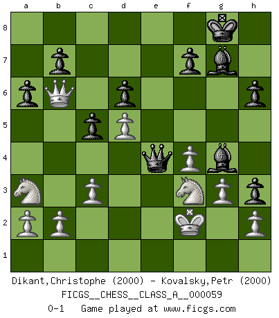 Last move : 0-1 2009 November 22 12:34:18 [Event "FICGS__CHESS__CLASS_A__000059"] [Site "FICGS"] [Date "2009.11.02"] [Round "1"] [White "Dikant,Christophe"] [Black "Kovalsky,Petr"] [Result "0-1"] [WhiteElo "2000"] [BlackElo "2000"] 1.d4 Nf6 2.Nf3 g6 3.Bf4 Bg7 4.e3 O-O 5.Be2 d6 6.O-O Nh5 7.Bg5 h6 8.Bh4 g5 9.Nfd2 gxh4 10.Bxh5 e5 11.c3 h3 12.g3 Nd7 13.f4 exd4 14.exd4 c5 15.d5 Nf6 16.Bf3 Bf5 17.Na3 Re8 18.Re1 Qd7 19.Qb3 a6 20.Qb6 Rxe1+ 21.Rxe1 Re8 22.Rxe8+ Qxe8 23.Kf2 Ng4+ 24.Bxg4 Bxg4 25.Nf3 Qe4 0-1 King's Indian : London system Kingside Castling by player Black (move 4) Kingside Castling by player White (move 6) Player Black won this chess game. Follow this game move after move (download)Combinations have always been the most intriguing aspect of Chess. The masters look for them, the public applauds them, the critics praise them. It is because combinations are possible that Chess is more than a lifeless mathematical exercise. They are the poetry of the game; they are to Chess what melody is to music. They represent the triumph of mind over matter. (Reuben Fine) Sie führen leise Selbstgespräche, schlürfen lautstark ihre Getränke, schmatzen hörbar beim Essen, blasen ihrem Gegenüber Rauch in die Augen, niesen ihm ins Gesicht, starren ihn unverwandt an, bis er sich unter ihren Blicken windet, rutschen ständig auf ihrem Stuhl hin und her, rülpsen und bohren in der Nase. (Anonymous) La única cosa que los jugadores de Ajedrez tienen en común, es el Ajedrez. (Lodewijk Prins) Plusieurs personnes se sont demandées comment Tal faisait pour gagner... En fait, c'est très simple ! Il met ses pièces au centre de l'échiquier et les sacrifie quelque part ! (David Bronstein) If we knew what we were doing, we would not call it research. (Albert Einstein)