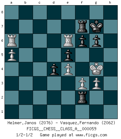 Last move : 1/2-1/2 2010 October 30 0:39:59 [Event "FICGS__CHESS__CLASS_A__000059"] [Site "FICGS"] [Date "2009.11.02"] [Round "1"] [White "Helmer,Janos"] [Black "Vasquez,Fernando"] [Result "1/2-1/2"] [WhiteElo "2076"] [BlackElo "2062"] 1.c4 e5 2.Nc3 Nf6 3.Nf3 Nc6 4.g3 Bb4 5.Bg2 O-O 6.O-O d6 7.d3 h6 8.Bd2 Be6 9.a3 Bxc3 10.Bxc3 Qd7 11.b4 Bh3 12.e4 a6 13.a4 Ne7 14.b5 Ng6 15.Ne1 Rfe8 16.f3 h5 17.Nc2 h4 18.Qd2 Bxg2 19.Qxg2 c6 20.bxc6 bxc6 21.Ne3 d5 22.Nf5 hxg3 23.hxg3 Ne7 24.Nxe7+ Qxe7 25.Qh3 Rab8 26.Kg2 g6 27.cxd5 cxd5 28.Qh6 Rb3 29.Rac1 d4 30.Bd2 Qf8 31.Rc6 Qxh6 32.Bxh6 Nd7 33.Rfc1 Rxd3 34.Rxa6 Nf8 35.Ra5 f6 36.Bxf8 Rd2+ 37.Kh3 Rxf8 38.Ra6 Kg7 39.Kg4 Ra2 40.a5 Rf7 41.R1c6 Rf2 42.Re6 1/2-1/2 English Opening Kingside Castling by player Black (move 5) Kingside Castling by player White (move 6) This chess game ended in a draw. Follow this game move after move (download)Don't even mention losing to me. I can't stand to think of it. (Bobby Fischer) Wenn ich mich einlogge, glauben die Leute gewöhnlich nicht, dass ich es selbst bin und sie fangen an, mir dumme Fragen zu stellen. Und wenn sie es glauben, stellen sie wieder andere dumme Fragen. (Judith Polgar) El Ajedrez es imaginación. (David Bronstein) Seul un grand joueur sait à quel point il joue faiblement. (Xavier Tartacover) He who is a good ruler must first have been ruled. (Aristotle)