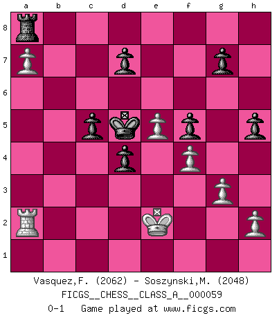 Last move : 0-1 2010 April 23 9:26:29 [Event "FICGS__CHESS__CLASS_A__000059"] [Site "FICGS"] [Date "2009.11.02"] [Round "1"] [White "Vasquez,Fernando"] [Black "Soszynski,Marek"] [Result "0-1"] [WhiteElo "2062"] [BlackElo "2048"] 1.e4 e5 2.Nf3 Nc6 3.d4 exd4 4.Nxd4 Nf6 5.Nxc6 bxc6 6.e5 Qe7 7.Qe2 Nd5 8.c4 Ba6 9.Qe4 Nb4 10.Nc3 Rd8 11.c5 Bxf1 12.Kxf1 Qxc5 13.Be3 Qa5 14.g3 Nd5 15.Nxd5 cxd5 16.Qd4 Be7 17.Kg2 O-O 18.Rhd1 c6 19.Qxa7 Qxa7 20.Bxa7 Ra8 21.Be3 Rfb8 22.b3 f5 23.Rd3 Kf7 24.a4 Ke6 25.Rc1 Rb7 26.f4 Rab8 27.R1c3 Ba3 28.Bf2 Bb2 29.Rc2 Rxb3 30.Rxb3 Rxb3 31.a5 d4 32.a6 Bc3 33.Ra2 Rb8 34.Kf1 Ra8 35.Be1 Bxe1 36.Kxe1 Kd5 37.Ke2 c5 38.a7 h5 0-1 This chess game has been lost on time (started : 2009.11.02 9:39:5) Scotch : Mieses variation Kingside Castling by player Black (move 17) Player Black won this chess game. Follow this game move after move (download)I played Chess with him and would have beaten him sometimes only he always took back his last move, and ran the game out differently. (Mark Twain) Gewöhnliche Menschen denken nur daran, wie sie ihre Zeit verbringen. Ein intelligenter Mensch versucht, sie auszunutzen. (Arthur Schopenhauer) Un sacrificio se refuta mucho mejor al aceptarlo. (Wilhelm Steinitz) Lorsque vous vous retrouvez devant une position atroce, ne tendez pas un ultime piège dérisoire avec l'intention d'abandonner si l'adversaire le déjoue ! Faites-vous plutôt un devoir de résister comme si votre vie en dépendait. Jouez le coup qui vous déplairait au centuple si vous étiez dans la peau de votre tortionnaire ! Beta. Software undergoes beta testing shortly before it's released. Beta is latin for still doesn't work. (Anonymous)