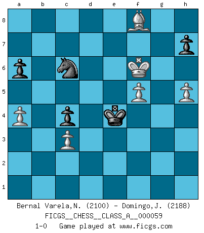 Last move : 1-0 2010 September 29 9:42:20 [Event "FICGS__CHESS__CLASS_A__000059"] [Site "FICGS"] [Date "2009.11.02"] [Round "1"] [White "Bernal Varela,Nelson"] [Black "Domingo,Jordi"] [Result "1-0"] [WhiteElo "2100"] [BlackElo "2188"] 1.e4 e5 2.Nf3 f5 3.Nxe5 Qf6 4.Nc4 fxe4 5.Nc3 Qg6 6.d3 Bb4 7.dxe4 Bxc3+ 8.bxc3 Qxe4+ 9.Ne3 Ne7 10.Bd3 Qh4 11.Rb1 O-O 12.O-O d6 13.g3 Qf6 14.Rb4 g6 15.Ng4 Bxg4 16.Qxg4 Nbc6 17.Rxb7 Ne5 18.Qd1 c6 19.f4 Nxd3 20.Qxd3 Rfb8 21.Qa6 Qe6 22.Bd2 Qc8 23.Rfb1 Rxb7 24.Qxb7 Nd5 25.Qxc8+ Rxc8 26.Rb7 Rc7 27.Rxc7 Nxc7 28.c4 Kf7 29.Kf2 Ke6 30.g4 d5 31.Ke3 dxc4 32.Kd4 Nb5+ 33.Kxc4 Nd6+ 34.Kd3 Kd5 35.Bc3 a6 36.Bd4 Nc4 37.Bc3 Nd6 38.Be5 Nc4 39.Ba1 Nd6 40.h3 Nc4 41.Bc3 Nd6 42.Ba1 Nc4 43.Bd4 Nd6 44.Bh8 Nc4 45.Bf6 Nd6 46.Be7 Nc4 47.f5 gxf5 48.gxf5 Ne5+ 49.Ke3 Nf7 50.Kf4 Ne5 51.h4 Nf7 52.Bf8 Ne5 53.h5 Nf7 54.a4 c5 55.c3 c4 56.Bb4 Ne5 57.Kg5 Nc6 58.Bf8 Ke4 59.Kf6 1-0 Latvian counter-gambit Kingside Castling by player Black (move 11) Kingside Castling by player White (move 12) Player White won this chess game. Follow this game move after move (download)At this time Fischer is simply a level above all the best Chessplayers in the world. (John Jacobs) Jeder Schachmeister war einmal ein Anfänger. (Irving Chernev) La señal de un Gran Maestro es su habilidad de ganar una partida rápidamente y sin dolor. (Irving Chernev) L'ordinateur a tué l'originalité. Il n'y a plus guère d'aventures sur l'échiquier. (Jacob Murray) O divine art of subtlety and secrecy! Through you we learn to be invisible, through you inaudible and hence we can hold the enemy's fate in our hands. (Sun Tzu)