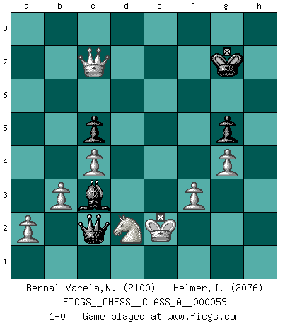 Last move : 1-0 2010 August 30 21:44:38 [Event "FICGS__CHESS__CLASS_A__000059"] [Site "FICGS"] [Date "2009.11.02"] [Round "1"] [White "Bernal Varela,Nelson"] [Black "Helmer,Janos"] [Result "1-0"] [WhiteElo "2100"] [BlackElo "2076"] 1.e4 c5 2.Nf3 Nf6 3.e5 Nd5 4.Nc3 Nxc3 5.dxc3 Nc6 6.Bc4 e6 7.Bf4 Be7 8.Qe2 Qc7 9.Rd1 O-O 10.O-O b6 11.Rfe1 Bb7 12.Bd3 Na5 13.c4 Qd8 14.b3 Bc6 15.Qe3 g6 16.Ng5 f5 17.exf6 Bxf6 18.Qg3 Qe7 19.Bd6 Qg7 20.Bxf8 Rxf8 21.h4 h6 22.Nh3 g5 23.hxg5 hxg5 24.Qg4 Rf7 25.Re3 Qh6 26.Rg3 Rg7 27.Be4 Kf8 28.Rgd3 Ke8 29.Bxc6 Nxc6 30.Rxd7 Rxd7 31.Qxe6+ Re7 32.Qxc6+ Kf7 33.Rd7 Rxd7 34.Qxd7+ Kg6 35.Kf1 Qh4 36.f3 Qg3 37.Qe8+ Kg7 38.Qd7+ Kg6 39.Nf2 Qf4 40.Ke2 Qc1 41.Qd3+ Kg7 42.g4 Kh6 43.Qd2 Qg1 44.Qd6 Kg7 45.Qc7+ Kg6 46.Qxa7 Qc1 47.Ne4 Qxc2+ 48.Nd2 Bc3 49.Qxb6+ Kg7 50.Qc7+ 1-0 Sicilian : Nimzovich-Rubinstein variation Kingside Castling by player Black (move 9) Kingside Castling by player White (move 10) Player White won this chess game. Follow this game move after move (download)Every Pawn is a potential Queen. (James Mason) Nur ein wirklich starker Spieler weiß wie schwach er spielt. (Savielly Grigorievitsch Tartakower) Con el fin de mejorar tu juego, debes de estudiar los finales antes que todo, ya que mientras que los finales pueden ser estudiados y dominados por sí mismos, el juegomedio y la apertura deben de ser estudiados en relación con los finales. (José Raúl Capablanca) C'est la seule position que je connaisse où les deux camps sont mals. Propos prêtés à V. Anand. I would love to change the world, but they won't give me the source code. (Unknown)