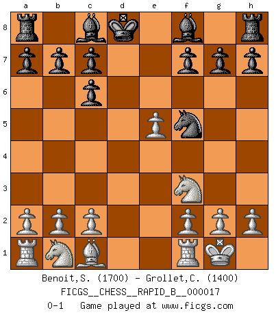 Last move : 0-1 2006 November 11 16:8:45 [Event "FICGS__CHESS__RAPID_B__000017"] [Site "FICGS"] [Date "2006.10.01"] [Round "1"] [White "Benoit,Sebastien"] [Black "Grollet,Christian"] [Result "0-1"] [WhiteElo "1700"] [BlackElo "1400"] 1.e4 e5 2.Nf3 Nc6 3.Bb5 Nf6 4.O-O Nxe4 5.d4 Nd6 6.Bxc6 dxc6 7.dxe5 Nf5 8.Qxd8+ Kxd8 0-1 This chess game has been lost on time (started : 2006.10.01 13:8:11) Ruy Lopez : Berlin defense, Open variation Kingside Castling by player White (move 4) Player Black won this chess game. Follow this game move after move (download)Strategy requires thought, tactics require observation. (Max Euwe) Die Arbeit ist etwas Unnatürliches. Die Faulheit allein ist göttlich. (Anatole France) La esencia del Ajedrez es pensar acerca de lo que el Ajedrez es. (David Bronstein) La tactique est l'élément le plus important du milieu de jeu. (Siegbert Tarrasch) Perhaps chess is the wrong game for the times (The Chess Master and the Computer, by Garry Kasparov - 2010)