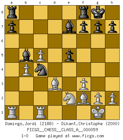 Last move : 1-0 2009 December 18 19:3:45 [Event "FICGS__CHESS__CLASS_A__000059"] [Site "FICGS"] [Date "2009.11.02"] [Round "1"] [White "Domingo,Jordi"] [Black "Dikant,Christophe"] [Result "1-0"] [WhiteElo "2188"] [BlackElo "2000"] 1.e4 d5 2.exd5 Nf6 3.Bb5+ Bd7 4.Bc4 Bg4 5.f3 Bc8 6.Nc3 Nbd7 7.d4 Nb6 8.Bb3 Nfxd5 9.Nxd5 Nxd5 10.c4 Nf6 11.Be3 e6 12.Ne2 Be7 13.O-O O-O 14.Bc2 c5 15.dxc5 Qa5 16.Qe1 Qxe1 17.Rfxe1 Nd7 18.b4 Ne5 19.Bd4 Nxc4 20.Bd3 b5 21.a4 Bd7 22.axb5 Bxb5 23.Rec1 e5 24.Bf2 1-0 Scandinavian defense Kingside Castling by player White (move 13) Kingside Castling by player Black (move 13) Player White won this chess game. Follow this game move after move (download)Chess is thirty to forty percent psychology. You don't have this when you play a computer. I can't confuse it. (Judith Polgar) Ich verstehe Aljechins Kombinationen ganz gut; aber woher er diese Angriffschancen bekommt und wie er die Eröffnung behandelt das ist für mich ein Buch mit sieben Siegeln. (Rudolf Spielmann) Cualquier cambio de material en una posición debe venir por medio de un mate, una captura o promoción de Peón. (Purdy) À la honte des hommes, on sait que les lois du jeu sont les seules qui soient partout justes, claires, inviolables et exécutées. Pourquoi l'Indien qui a donné les règles du jeu d'échecs est-il obéi de bon gré dans toute la terre, et que les décrétales des papes, par exemple, sont aujourd'hui un objet d'horreur et de mépris ? C'est que l'inventeur des échecs combina tout avec justesse pour la satisfaction des joueurs, et que les papes, dans leurs décrétales, n'eurent en vue que leur seul avantage. L'Indien voulut exercer également l'esprit des hommes et leur donner du plaisir; les papes ont voulu abrutir l'esprit des hommes. Voltaire (Dictionnaire philosophique / Garnier 1967) In theory there is no difference between theory and practice. In practice there is. (Yogi Berra)