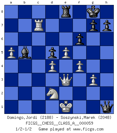 Last move : 1/2-1/2 2010 January 13 20:56:22 [Event "FICGS__CHESS__CLASS_A__000059"] [Site "FICGS"] [Date "2009.11.02"] [Round "1"] [White "Domingo,Jordi"] [Black "Soszynski,Marek"] [Result "1/2-1/2"] [WhiteElo "2188"] [BlackElo "2048"] 1.e4 e5 2.Nf3 Nc6 3.Bc4 Bc5 4.c3 Nf6 5.d4 exd4 6.e5 d5 7.Bb5 Ne4 8.cxd4 Bb4+ 9.Bd2 Nxd2 10.Bxc6+ bxc6 11.Nbxd2 O-O 12.Rc1 Ba6 13.Qa4 Bxd2+ 14.Kxd2 Bb5 15.Qc2 a5 16.a4 Ba6 17.Qxc6 Bc4 18.Rc3 Ra6 19.Qc5 Rb6 20.b3 Rxb3 21.Rxb3 Bxb3 22.Rc1 Bc4 23.Ke1 Qb8 24.Qxa5 Qb2 25.Qd2 Qb6 26.g3 f6 27.Qc3 Re8 28.a5 Qe6 29.Nd2 Bb5 30.f4 Qh3 31.Qe3 Qxh2 32.Rxc7 Qh1+ 1/2-1/2 Giuoco Piano Kingside Castling by player Black (move 11) This chess game ended in a draw. Follow this game move after move (download)The way he plays Chess demonstrates a man's whole nature. (Stanley Ellin) Konzentriere dich auf materielle Gewinne. Nimm, was dir dein Gegner gibt, ausser es gibt einen guten Grund der dagegenspricht. (Robert James Fischer) Estaba muy claro de que el punto vulnerable del Gran Maestro Americano (Bobby Fischer) radicaba en las posiciones de doble filo, colgantes, irracionales, donde el siempre falló en encontrar un triunfo aún en una posición de clara victoria. (Efim Geller) Vous savez, camarade Pachman, je n'éprouve pas de plaisir à être ministre, je jouerais plutôt aux échecs comme vous, ou alors ferais une révolution au Venezuela. (Che Guevara à Ludek Pachman, 'Checkmate in Prague', 1975) The Internet is the first thing that humanity has build that humanity doesn't understand, the largest experiment in anarchy that we have ever had. (Eric Schmidt)
