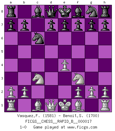 Last move : 1-0 2006 November 11 10:6:48 [Event "FICGS__CHESS__RAPID_B__000017"] [Site "FICGS"] [Date "2006.10.01"] [Round "1"] [White "Vasquez,Fernando"] [Black "Benoit,Sebastien"] [Result "1-0"] [WhiteElo "1581"] [BlackElo "1700"] 1.e4 c5 2.d4 cxd4 3.c3 dxc3 4.Nxc3 Nc6 5.Nf3 1-0 This chess game has been lost on time (started : 2006.10.01 13:8:11) Sicilian : Smith-Morra gambit Player White won this chess game. Follow this game move after move (download)There is only one thing Fischer does in Chess without pleasure: to lose ! (Boris Spassky) Fallen sollten polizeilich verboten werden. (Savielly Grigorievitsch Tartakower) Aquel que ve no otra dirección en el juego que la de dar Jaque Mate a su oponente, nunca será un buen jugador de Ajedrez. (Euwe) Votre seul travail dans les ouvertures est d'obtenir un milieu de partie jouable. (Lajos Portish) The mind is like a parachute, it only functions when its open. (Unknown)