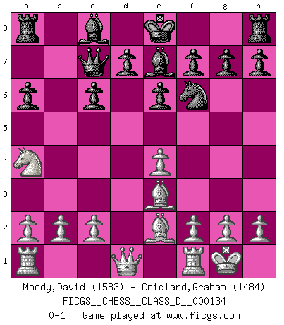 Last move : 0-1 2009 November 19 23:43:19 [Event "FICGS__CHESS__CLASS_D__000134"] [Site "FICGS"] [Date "2009.11.02"] [Round "1"] [White "Moody,David"] [Black "Cridland,Graham"] [Result "0-1"] [WhiteElo "1582"] [BlackElo "1484"] 1.e4 c5 2.Nf3 Nc6 3.d4 cxd4 4.Nxd4 e6 5.Nc3 Qc7 6.Be3 a6 7.Be2 Nf6 8.O-O Bb4 9.Na4 Be7 10.Nxc6 bxc6 0-1 Sicilian defense Kingside Castling by player White (move 8) Player Black won this chess game. Follow this game move after move (download)I have added these principles to the law: get the Knights into action before both Bishops are developed. (Emanuel Lasker) Heutzutage gewinnt im Turnier nicht derjenige Spieler, der weitreichende Pläne entwirft, sondern einfach jener, der Zug um Zug kämpft. (David Bronstein) Fischer es el jugador mas fuerte del mundo. De hecho, el jugador mas fuerte que jamas haya existido. (Larry Evans) Echiquier : carré parfait, comme la Jérusalem nouvelle décrite par l'auteur de l'Apocalypse, huit cases sur huit, exaltation du chiffre 4, symbole du cosmos aux quatre horizons... où le noir et le blanc, l'ombre et la lumière, le mal et le bien s'entremêlent et se conjuguent. (Robert Couffignal, Le Gambit du poète) CHESS, n. f. [echecs, Fr.] A nice and abstruse game, in which two sets of puppets are moved in opposition to each other. (Dr Samuel Johnson, A Dictionary Of The English Language, 1755)