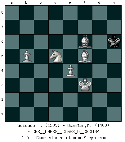 Last move : 1-0 2009 November 12 17:2:30 [Event "FICGS__CHESS__CLASS_D__000134"] [Site "FICGS"] [Date "2009.11.02"] [Round "1"] [White "Guisado,Francisco"] [Black "Quanter,Kirsty"] [Result "1-0"] [WhiteElo "1599"] [BlackElo "1400"] 1.d4 d5 2.c4 c6 3.Nf3 Bg4 4.Qb3 b6 5.Ne5 Bh5 6.e3 f6 7.cxd5 fxe5 8.dxc6 Nxc6 9.Bb5 Rc8 10.d5 Bf7 11.dxc6 Bxb3 12.c7 Kf7 13.cxd8Q Rxd8 14.axb3 Rc8 15.Nc3 e6 16.Rxa7+ Be7 17.Ke2 Nf6 18.Rd1 Rhd8 19.Rxd8 Rxd8 20.Rb7 Kg6 21.Rxb6 Rd6 22.Rxd6 Bxd6 23.e4 h5 24.h4 Kh7 25.Bc4 Nd7 26.Bxe6 Nc5 27.Bd5 Be7 28.b4 Nd7 29.b5 Bxh4 30.Na4 g5 31.g3 Bxg3 32.fxg3 h4 33.gxh4 gxh4 34.b6 Nxb6 35.Nxb6 Kg6 36.Kf3 Kh5 37.Be6 h3 38.Bxh3 Kh4 39.Bf5 Kh5 40.b4 Kh4 41.Bb2 Kg5 42.Bxe5 Kh5 43.Nd5 Kg5 44.b5 Kh6 45.Bf6 1-0 QGD Slav : 3.Nf3 Promotion Queen by player White (move 13) 10 pieces endgame at move 34 : White KBBNPP , Black KNPP WHITE : King + 2 Bishops 1 Knight 2 Pawns BLACK : King + 1 Knight 2 Pawns 9 pieces endgame at move 35 : White KBBNPP , Black KPP WHITE : King + 2 Bishops 1 Knight 2 Pawns BLACK : King + 2 Pawns 8 pieces endgame at move 38 : White KBBNPP , Black KP WHITE : King + 2 Bishops 1 Knight 2 Pawns BLACK : King + 1 Pawn 7 pieces endgame at move 42 : White KBBNPP , Black K WHITE : King + 2 Bishops 1 Knight 2 Pawns BLACK : King + Player White won this chess game. Follow this game move after move (download)A good sacrifice is one that is not necessarily sound but leaves your opponent dazed and confused. (Rudolph Spielmann) Wir irren allesamt, nur jeder irrt anders. (Georg Christoph Lichtenberg) Después de la respuesta de las negras a 1.e4 con 1..e5, se quedan siempre tratando de entrar dentro del juego. (Howard Staunton) La guerre est enfant de la passion, la passion est enfant du narcissisme et le narcissisme est l'enfant. (...) Une autre partie ? (Thibault de Vassal) The large trees attract high winds. (Chinese proverb)