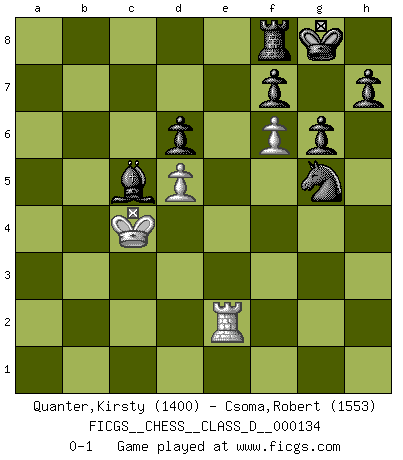 Last move : 0-1 2010 May 18 15:24:41 [Event "FICGS__CHESS__CLASS_D__000134"] [Site "FICGS"] [Date "2009.11.02"] [Round "1"] [White "Quanter,Kirsty"] [Black "Csoma,Robert"] [Result "0-1"] [WhiteElo "1400"] [BlackElo "1553"] 1.d4 Nf6 2.c4 c5 3.Nf3 g6 4.Bg5 Bg7 5.d5 O-O 6.Nc3 d6 7.e4 Bg4 8.Be2 Nbd7 9.h3 Bxf3 10.Bxf3 a6 11.a4 Qc7 12.a5 Ne5 13.O-O Nxc4 14.b3 Ne5 15.Bf4 Nxf3+ 16.Qxf3 c4 17.Rfb1 Rac8 18.bxc4 Qxc4 19.Bd2 Rc7 20.g4 Nd7 21.Ra3 Ne5 22.Qe3 Qc5 23.Qxc5 Rxc5 24.Rxb7 Nf3+ 25.Kf1 Nxd2+ 26.Ke2 Bxc3 27.Kd3 Bxa5 28.Ra7 Nc4 29.Rb3 Ne5+ 30.Ke3 Nc4+ 31.Kd3 Ne5+ 32.Ke3 Rc3+ 33.Rxc3 Bxc3 34.Rxa6 Bb4 35.f4 Nd7 36.Kd4 Bc5+ 37.Kc4 Nf6 38.Ra7 Nxe4 39.Rxe7 Nf2 40.f5 Nxh3 41.f6 Nf2 42.g5 Nh3 43.Re2 Nxg5 0-1 Benoni defense Kingside Castling by player Black (move 5) Kingside Castling by player White (move 13) Player Black won this chess game. Follow this game move after move (download)Kasparov : J'adoube , Ivanchuk : S'il vous plaît ! (Garry Kasparov & Vassily Ivanchuk, Linares 1997) Die Jungen erwarten, dass Opa einfach umfällt. Dann aber kann Opa fünf Stunden lang Schach spielen und die jungen Gegner an die Wand drücken. (Viktor Kortschnoi) Yo adoro todas la posiciones. Denme una partida posicional difÃcil, y la jugaré. Pero posiciones totalmente ganadas, no las tolero. (Hein Donner) Le temps de noter son nom sur la feuille de partie, j'étais déjà en zeitnot ! D'un modeste amateur apparié lors de la première ronde d'un open contre le grand-maître Azmaïparashvili. Creativity involves breaking out of established patterns in order to look at things in a different way. (Edward De Bono)
