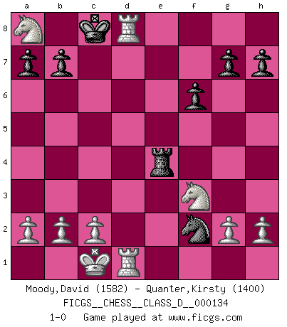Last move : 1-0 2009 November 7 22:40:25 [Event "FICGS__CHESS__CLASS_D__000134"] [Site "FICGS"] [Date "2009.11.02"] [Round "1"] [White "Moody,David"] [Black "Quanter,Kirsty"] [Result "1-0"] [WhiteElo "1582"] [BlackElo "1400"] 1.e4 d6 2.d4 e5 3.Nf3 Bg4 4.dxe5 dxe5 5.Qxd8+ Kxd8 6.Nxe5 Be6 7.Nc3 f6 8.Nf3 Nd7 9.Bf4 Bd6 10.Bxd6 cxd6 11.O-O-O Nh6 12.Rxd6 Re8 13.Bb5 Ng4 14.Bxd7 Bxd7 15.Rhd1 Re7 16.R6d2 Ke8 17.Nd5 Rxe4 18.Nc7+ Kd8 19.Rxd7+ Kc8 20.Nxa8 Nxf2 21.Rd8+ 1-0 King's pawn Opening Queenside Castling by player White (move 11) Player White won this chess game. Follow this game move after move (download)Fischer is the strongest player in the world. In fact, the strongest player who ever lived. (Larry Evans) Schach ist wie eine schöne Frau, zu der wir ständig zurückkehren, gleichviel, wie oft sie uns zurückweist. (Anonymous) Debemos de asegurarnos de que el Ajedrez no se convierta en un lenguaje muerto, muy interesante, pero tan solo para un grupo muy pequeño. (Sytze Faber) Je fais ceci parce que dans cinquante coups j'obtiendrai cela; je m'appelle Mikhail Moisevitch Botvinnik. (Botvinnik) Just because you do not take an interest in politics doesn't mean politics won't take an interest in you. (Pericles 430 B.C.)