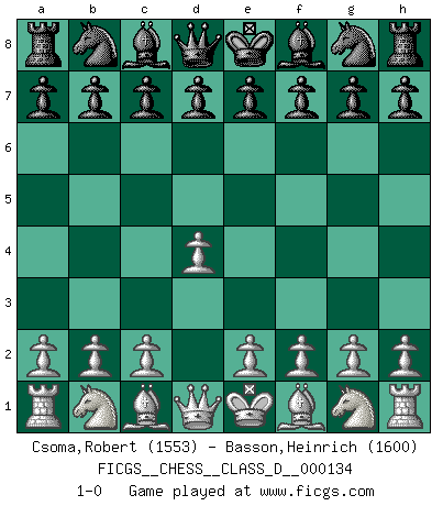 Last move : 1-0 2009 November 11 21:3:41 [Event "FICGS__CHESS__CLASS_D__000134"] [Site "FICGS"] [Date "2009.11.02"] [Round "1"] [White "Csoma,Robert"] [Black "Basson,Heinrich"] [Result "1-0"] [WhiteElo "1553"] [BlackElo "1600"] 1.d4 1-0 Queen's pawn Player White won this chess game. Follow this game move after move (download)Chess is like war on a board. (Bobby Fischer) Ich weiss nicht was Gott gegen mich auf 1.e4 antworten würde. (Robert James Fischer) El Ajedrez es despiadado: debes de estar preparado para matar gente. (Nigel Short) Si le désir cupide (et stupide) de gagner est une inépuisable source de souffrance, une combinaison brillante sur l'échiquier est une découverte : le coquelicot qui s'épanouit lorsque apparaît la Voie Lactée. (Arrabal) Always be a first-rate version of yourself, instead of a second-rate version of somebody else. (Judy Garland)