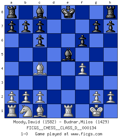 Last move : 1-0 2009 November 14 17:48:36 [Event "FICGS__CHESS__CLASS_D__000134"] [Site "FICGS"] [Date "2009.11.02"] [Round "1"] [White "Moody,David"] [Black "Budnar,Milos"] [Result "1-0"] [WhiteElo "1582"] [BlackElo "1429"] 1.e4 e5 2.Nf3 Nc6 3.Bc4 Nf6 4.d4 exd4 5.O-O Nxe4 6.Re1 Qe7 7.Nxd4 Qe5 8.Nxc6 dxc6 9.Qe2 Bd6 10.Qxe4 f6 11.Qxe5+ Bxe5 12.f4 1-0 Two knights defense Kingside Castling by player White (move 5) Player White won this chess game. Follow this game move after move (download)I am still a victim of Chess. It has all the beauty of art and much more. It cannot be commercialized. Chess is much purer than art in its social position. (Marcel Duchamp) Wenn ich mich einlogge, glauben die Leute gewöhnlich nicht, dass ich es selbst bin und sie fangen an, mir dumme Fragen zu stellen. Und wenn sie es glauben, stellen sie wieder andere dumme Fragen. (Judith Polgar) Si no le temes a Spassky, entonces elimino el elemento del dinero. (Jim Slater) Karpov est une pièce de musée. (Garry Kasparov) I feel so... helpless. (C-3PO in Star Wars ep.3)