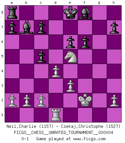 Last move : 0-1 2009 December 12 11:6:2 [Event "FICGS__CHESS__UNRATED_TOURNAMENT__000004"] [Site "FICGS"] [Date "2009.11.02"] [Round "1"] [White "Neil,Charlie"] [Black "Czekaj,Christophe"] [Result "0-1"] [WhiteElo "1157"] [BlackElo "1527"] 1.d4 e6 2.e4 d5 3.Nc3 Nc6 4.Bb5 Nf6 5.Bg5 dxe4 6.Nxe4 Qd5 7.Nxf6+ gxf6 8.Bxf6 Rg8 9.Bxc6+ bxc6 10.Nf3 Rxg2 11.Ne5 Rg6 12.Rf1 Rxf6 13.Qd2 Qe4+ 14.Qe3 Qxe3+ 15.fxe3 Rxf1+ 16.Kxf1 Bb7 17.Kf2 c5 18.Rd1 f6 0-1 Queen's pawn Player Black won this chess game. Follow this game move after move (download)Mistrust is the most necessary characteristic of the Chess player. (Siegbert Tarrasch) Modernes Schach sorgt sich zuviel um Dinge wie Bauernstruktur usw. Vergessen Sie das, Schachmatt beendet das Spiel! (Nigel Short) Hay jugadores fuertes y personas amables y yo soy un jugador fuerte. (Bobby Fischer) Vous n'êtes pas toujours obligé de jouer le meilleur coup. Un coup doit être actif, entreprenant, correct et beau ! (David Bronstein) If you lose the game you should win the analysis! (Proverb)