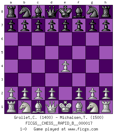 Last move : 1-0 2006 October 31 20:8:56 [Event "FICGS__CHESS__RAPID_B__000017"] [Site "FICGS"] [Date "2006.10.01"] [Round "1"] [White "Grollet,Christian"] [Black "Michalsen,Trond"] [Result "1-0"] [WhiteElo "1400"] [BlackElo "1500"] 1.e4 1-0 This chess game has been lost on time (started : 2006.10.01 13:8:11) King's pawn Opening Player White won this chess game. Follow this game move after move (download)Many have become Chess Masters, no one has become the Master of Chess. (Siegbert Tarrasch) Pläne sind die Träume des Verständigen. (Ernst Freiherr von Feuchtersleben) Yo tuve un dolor de muelas en la primer partida. En el segundo juego, tuve un dolor de cabeza. En el tercero, tuve un ataque de reumatísmo. En la cuarta partida, no me sentía muy bien. ¿Y en el quinto juego? Bueno, ¿que acaso uno tiene que ganar todos los juegos?. (Siegbert Tarrasch) Les échecs c'est le défi de l'alpiniste, toujours plus haut, prêt à tout pour monter à l'assaut du Roi ennemi. Les échecs, c'est de la musique en mouvement, un ballet majestueux pour les yeux. C'est de la poésie composée par les fantômes du passé qui au même titre que Rimbaud ou Verlaine méritent notre admiration. Les échecs, c'est de la peinture ou le moindre mouvement modifie le tableau pour en faire un Picasso ou un Van Gogh. Les échecs, c'est tout et rien, c'est la vie et la mort. Jjulie33 sur le forum de France-Echecs. Optimism is a variety of information deficit. Sometimes especially true for correspondence chess games. (Michael Aigner)
