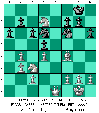 Last move : 1-0 2009 November 15 21:48:36 [Event "FICGS__CHESS__UNRATED_TOURNAMENT__000004"] [Site "FICGS"] [Date "2009.11.02"] [Round "1"] [White "Zimmermann,Melchior"] [Black "Neil,Charlie"] [Result "1-0"] [WhiteElo "1800"] [BlackElo "1157"] 1.e4 e6 2.Nf3 d5 3.exd5 exd5 4.Nc3 Be7 5.Be2 Nf6 6.O-O O-O 7.d4 Bf5 8.Bf4 Nbd7 9.Qd2 c6 10.Rfe1 Bb4 11.a3 Re8 12.axb4 a6 13.Ne5 Nb6 14.Bd3 Bxd3 15.Nxd3 Qd7 16.Rxe8+ Rxe8 17.Re1 Rxe1+ 18.Qxe1 Nc4 19.b3 h6 20.Nc5 Nd6 21.Nxd7 1-0 French defense Kingside Castling by player White (move 6) Kingside Castling by player Black (move 6) Player White won this chess game. Follow this game move after move (download)If a ruler does not understand Chess, how can he rule over a kingdom ? (King Khusros II) Das Blackmar-Diemer-Gambit verändert den ganzen Menschen! (Emil Joseph Diemer) Me gusta decir que Bobby Fischer fue el mejor jugador que jamás haya existido. Pero lo que hizo de Fischer un genio, fue su habilidad de mezclar una frescura y pragmatismo Americano con ideas Rusas acerca de la estrategia. (Bruce Pandolfini) Les écrivains ont utilisé les échecs pour analyser les côtés extrêmes de la nature humaine. Dans ce cadre, les échecs offrent un champ d'expérimentation idéal. Mais on pourrait faire la même chose avec la peinture. Et là, en vous référant à Van Gogh, vous ne tirerez pas de conclusion définitive sur les peintres. (Gary Kasparov) Chess, like love, like music, has the power to make people happy. (Siegbert Tarrasch)
