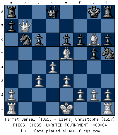 Last move : 1-0 2009 December 2 15:58:49 [Event "FICGS__CHESS__UNRATED_TOURNAMENT__000004"] [Site "FICGS"] [Date "2009.11.02"] [Round "1"] [White "Parmet,Daniel"] [Black "Czekaj,Christophe"] [Result "1-0"] [WhiteElo "1962"] [BlackElo "1527"] 1.d4 e6 2.Nf3 d5 3.c4 c6 4.Nc3 Nf6 5.Bg5 Nbd7 6.e3 h6 7.Bh4 g5 8.Bg3 Bb4 9.Nd2 Qa5 10.Qb3 dxc4 11.Nxc4 Bxc3+ 12.bxc3 Qd8 13.Nd6+ Kf8 14.Bd3 Nh5 15.Nxb7 Bxb7 16.Bd6+ Kg8 17.Qxb7 Nb6 18.Be5 f6 19.Bg6 1-0 Queen's pawn Player White won this chess game. Follow this game move after move (download)Checkers is for tramps. (Paul Morphy) Ohne ihre Erfolge schmälern zu wollen würde ich sagen Petrosian, Spassky und Karpov verdanken ihre Siege ihren Trainern - Boleslavsky, Bondarevsky und Furman. (Mikhail Moiseyevich Botvinik) Peones: ellos son el alma de esta partida, solos forman el ataque y la defensa. (Philidor) Le système Elo représente seulement une moyenne. Il est simplement un indicateur de votre stabilité. (Anatoli Karpov) I can't decide which is riskier; taking crazy risks, or taking advice on crazy risks from a crazy risk taker. (Gregory House in House M.D.)