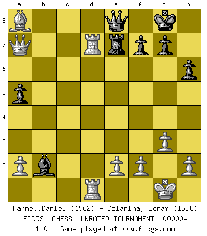 Last move : 1-0 2009 December 9 14:28:53 [Event "FICGS__CHESS__UNRATED_TOURNAMENT__000004"] [Site "FICGS"] [Date "2009.11.02"] [Round "1"] [White "Parmet,Daniel"] [Black "Colarina,Floram"] [Result "1-0"] [WhiteElo "1962"] [BlackElo "1598"] 1.d4 d5 2.Nf3 c5 3.c4 e6 4.cxd5 exd5 5.g3 Nc6 6.Bg2 Bd6 7.O-O Nf6 8.Nc3 O-O 9.Bg5 h6 10.Bxf6 Qxf6 11.Nxd5 Qd8 12.dxc5 Bxc5 13.Rc1 Bd6 14.Nd4 Nxd4 15.Qxd4 Re8 16.Rfd1 Be5 17.Qb4 a5 18.Qb5 Bd7 19.Qxb7 Rb8 20.Qa7 Bxb2 21.Rc7 Ra8 22.Ne7+ Rxe7 23.Bxa8 Qe8 24.Rcxd7 1-0 Queen's pawn game, Krause variation Kingside Castling by player White (move 7) Kingside Castling by player Black (move 8) Player White won this chess game. Follow this game move after move (download)In complicated positions, Bobby Fischer hardly had to be afraid of anybody. (Paul Keres) Schach ist das schnellste Spiel der Welt, weil man in jeder Sekunde Tausende von Gedanken ordnen muß. (Albert Einstein) a manera como él juega al Ajedrez, demuestra la completa naturaleza de un hombre. (Stanley Ellin) Horreur, mais aussi harmonie suprême : qu'y avait-il en effet au monde en dehors des échecs ? Le brouillard, l'inconnu, le non-être... (Vladimir Nabokov) There is no vagueness without wind. (Chinese proverb)