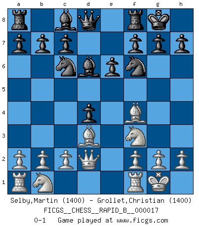 Last move : 0-1 2006 December 3 16:53:49 [Event "FICGS__CHESS__RAPID_B__000017"] [Site "FICGS"] [Date "2006.10.01"] [Round "1"] [White "Selby,Martin"] [Black "Grollet,Christian"] [Result "0-1"] [WhiteElo "1400"] [BlackElo "1400"] 1.e4 e6 2.e5 d6 3.Nf3 Nc6 4.d4 dxe5 5.Bd3 exd4 6.O-O Nf6 7.Bf4 Bd6 8.Qd2 O-O 0-1 French : Steinitz attack Kingside Castling by player White (move 6) Kingside Castling by player Black (move 8) Player Black won this chess game. Follow this game move after move (download)Fischer is completely natural. He plays no roles. He's like a child. Very, very simple. (Zita Rajcsanyi) Schach ist ein Reich, wo sich die menschliche Phantasie frei entfalten kann. (David Bronstein) Fischer no está bajo la obligación de nadie. (Joseph Platz) Les échecs, c'est la lutte contre l'erreur. (Johannes Zukertort) I believe in luck. How else can you explain the success of those you dislike ? (Jean Cocteau)