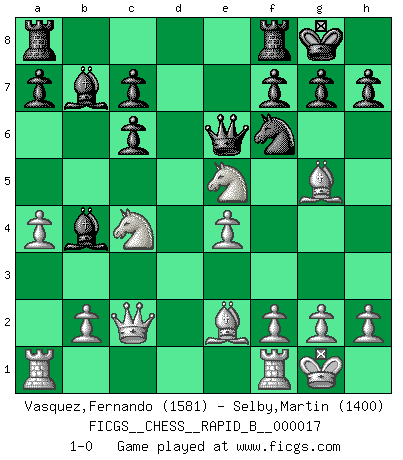 Last move : 1-0 2006 December 3 16:53:49 [Event "FICGS__CHESS__RAPID_B__000017"] [Site "FICGS"] [Date "2006.10.01"] [Round "1"] [White "Vasquez,Fernando"] [Black "Selby,Martin"] [Result "1-0"] [WhiteElo "1581"] [BlackElo "1400"] 1.e4 e5 2.Nf3 Nc6 3.d4 Bb4+ 4.c3 Bd6 5.d5 Nf6 6.dxc6 dxc6 7.Qc2 O-O 8.Be2 Qe7 9.O-O b5 10.a4 b4 11.cxb4 Bb7 12.Bg5 Bxb4 13.Nbd2 Qd6 14.Nc4 Qe6 15.Nfxe5 1-0 Scotch Opening Kingside Castling by player Black (move 7) Kingside Castling by player White (move 9) Player White won this chess game. Follow this game move after move (download)Botvinnik tried to take the mystery out of Chess, always relating it to situations in ordinary life. He used to call Chess a typical inexact problem similar to those which people are always having to solve in everyday life. (Garry Kasparov) Wenn Du absolut nicht mehr weißt, was Du tun sollst, dann ist es Zeit für Panik. (John van der Wiel) Siempre es mucho mejor sacrificar las piezas de tu oponente. (Savielly Tartakover) Pour moi, les échecs ne sont pas un jeu mais un art. (Alexandre Alekhine) Art disturbs, science reassures. (Georges Braque, Le Jour et la Nuit)