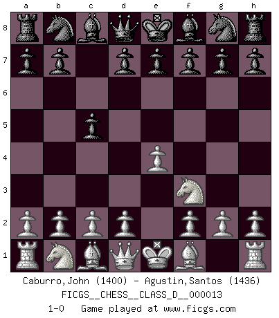 Last move : 1-0 2006 November 11 16:8:45 [Event "FICGS__CHESS__CLASS_D__000013"] [Site "FICGS"] [Date "2006.10.02"] [Round "1"] [White "Caburro,John"] [Black "Agustin,Santos"] [Result "1-0"] [WhiteElo "1400"] [BlackElo "1436"] 1.e4 c5 2.Nf3 1-0 This chess game has been lost on time (started : 2006.10.02 1:22:44) Sicilian defense Player White won this chess game. Follow this game move after move (download)Chess problems demand from the composer the same virtues that characterize all worthwhile art: originality, invention, conciseness, harmony, complexity, and splendid insincerity. (Vladimir Nabokov) Im Internet Chess Club betrug mein Rating vorübergehend 3350 ELO-Punkte. (Sergej Karjakin) El Ajedrez es un regaderazo frío para la mente. (Sir John Simon) Les Cavaliers se révèlent fort utiles dans les positions fermées. D'habitude, les Fous sont un peu plus forts que les Cavaliers dans les positions ouvertes. Qu'on le veuille ou non, il restera toujours des exceptions ! There is a great deal of difference between an eager man who wants to read a book and a tired man who wants a book to read. (G.K. Chesterton)