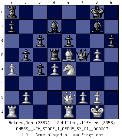 Last move : 1-0 2009 December 23 21:43:18 [Event "FICGS__CHESS__WCH_STAGE_1_GROUP_SM_01__000007"] [Site "FICGS"] [Date "2009.11.02"] [Round "1"] [White "Rotaru,Dan"] [Black "Schiller,Wilfried"] [Result "1-0"] [WhiteElo "2387"] [BlackElo "2353"] 1.d4 d5 2.c4 c6 3.Nf3 Nf6 4.Nc3 e6 5.Bg5 h6 6.Bh4 g5 7.Bg3 dxc4 8.e4 b5 9.Be2 Bb7 10.O-O Nbd7 11.Ne5 Bg7 12.Nxd7 Qxd7 13.e5 Nd5 14.Ne4 O-O 15.a4 Rfd8 16.Bh5 Qe7 17.Re1 f5 18.exf6 Nxf6 19.Nc5 Nxh5 20.Qxh5 Bc8 21.Be5 Qf7 22.Qe2 Rd5 23.Ne4 Bd7 24.h4 Qf5 25.hxg5 1-0 QGD Slav : 4.Nc3 Kingside Castling by player White (move 10) Kingside Castling by player Black (move 14) Player White won this chess game. Follow this game move after move (download)Man is a frivolous, a specious creature, and like a Chess player, cares more for the process of attaining his goal than for the goal itself. (Dostoyevsky) Wenn du auf das Glück wartest, wird das Leben ziemlich langweilig. (Mikhail Nekhemyevich Tal) Para mi, el Ajedrez es la vida y cada partida es como una nueva vida. Todo jugador de Ajedrez suele vivir muchas vidas durante su vida. (Eduard Gufeld) Je crois qu'il existe des manières très spécifiques de jouer efficacement contre une machine. Evidemment, nous n'avons aucune chance en technique pure, parce que l'ordinateur calcule de manière parfaite. Mais lorsque nous faisons appel à notre cerveau, en utilisant l'intuition et la compréhension, alors nous restons beaucoup plus forts. (Anatoli Karpov) A clear conscience is usually the sign of a bad memory. (Unknown)