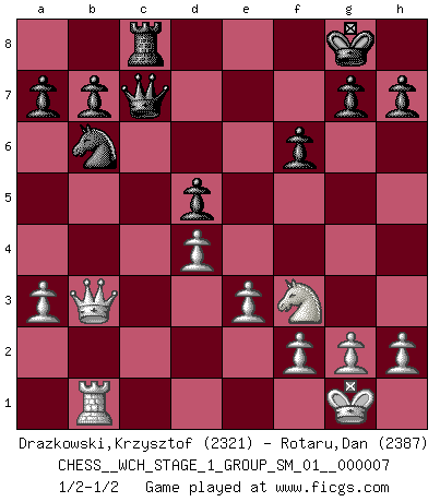 Last move : 1/2-1/2 2009 December 15 12:44:27 [Event "FICGS__CHESS__WCH_STAGE_1_GROUP_SM_01__000007"] [Site "FICGS"] [Date "2009.11.02"] [Round "1"] [White "Drazkowski,Krzysztof"] [Black "Rotaru,Dan"] [Result "1/2-1/2"] [WhiteElo "2321"] [BlackElo "2387"] 1.d4 Nf6 2.c4 e6 3.Nf3 d5 4.cxd5 exd5 5.Nc3 Be7 6.Bg5 c6 7.e3 Bf5 8.Bd3 Bxd3 9.Qxd3 Nbd7 10.O-O O-O 11.a3 Ne4 12.Bxe7 Qxe7 13.b4 Nb6 14.Rfc1 Rfe8 15.b5 Rac8 16.bxc6 Rxc6 17.Ne5 Rxc3 18.Rxc3 f6 19.Nf3 Nxc3 20.Qxc3 Rc8 21.Qb3 Qc7 22.Rb1 1/2-1/2 Queen's pawn game Kingside Castling by player White (move 10) Kingside Castling by player Black (move 10) This chess game ended in a draw. Follow this game move after move (download)You sit at the board and suddenly your heart leaps. Your hand trembles to pick up the piece and move it. But what Chess teaches you is that you must sit there calmly and think about whether it's really a good idea and whether there are other better ideas. (Stanley Kubrick) Die Auseinandersetzung mit Karpow war politisch geprägt. Er stand für das kommunistische System, wurde von dessen Repräsentanten gehätschelt. Ich war der Oppositionelle. Jeder Schachweltmeister spiegelt auch die gesellschaftlichen Verhältnisse wider. Kramnik steht für die Börsen-Generation des Neuen Markts, ideologiefrei, zahlenfixiert. (Garry Kasparov) No puedes jugar al Ajedrez si eres de corazón noble. (Proverbio Francés) Ce n'est pas pour s'amuser qu'il joue aux échecs : il célèbre un culte. (Vladimir Nabokov) Life is verb, not a noun. (Charlotte Perkins Gilman)