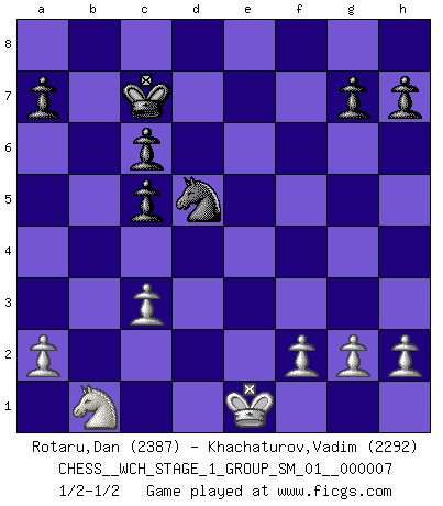 Last move : 1/2-1/2 2009 December 12 20:49:57 [Event "FICGS__CHESS__WCH_STAGE_1_GROUP_SM_01__000007"] [Site "FICGS"] [Date "2009.11.02"] [Round "1"] [White "Rotaru,Dan"] [Black "Khachaturov,Vadim"] [Result "1/2-1/2"] [WhiteElo "2387"] [BlackElo "2292"] 1.e4 c5 2.Nf3 d6 3.Bb5+ Bd7 4.Bxd7+ Qxd7 5.O-O Nc6 6.c3 Nf6 7.d4 Nxe4 8.d5 Ne5 9.Re1 Nxf3+ 10.Qxf3 Nf6 11.Na3 O-O-O 12.b4 e6 13.Bg5 Be7 14.bxc5 dxc5 15.dxe6 fxe6 16.Rad1 Qc6 17.Qxc6+ bxc6 18.Rb1 Rhe8 19.Rxe6 Nd5 20.Rbe1 Kd7 21.Bxe7 Rxe7 22.Rxe7+ Nxe7 23.Rd1+ Kc8 24.Rxd8+ Kxd8 25.Kf1 Nd5 26.Nb1 Kc7 27.Ke1 1/2-1/2 Sicilian : Canal-Sokolsky attack, Bronstein gambit Kingside Castling by player White (move 5) Queenside Castling by player Black (move 11) This chess game ended in a draw. Follow this game move after move (download)Blessed be the memory of him who gave the world this immortal game. (A. G. Gardiner) Ich habe kein Problem mit Frauen, sondern nur mit dem Niveau ihres Schachspiels (Judith Polgar) Fischer deseaba darle a los Rusos una sopa de su propia medicina. (Larry Evans) Fischer est le meilleur joueur du monde et Karpov n'est qu'un joueur de bistrot. (Garry Kasparov, agé de 16 ans) You must do what you feel is right... of course. (Obi-Wan Kenobi in Star Wars ep.4)