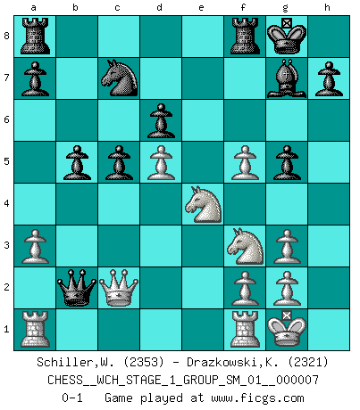 Last move : 0-1 2009 December 25 22:4:28 [Event "FICGS__CHESS__WCH_STAGE_1_GROUP_SM_01__000007"] [Site "FICGS"] [Date "2009.11.02"] [Round "1"] [White "Schiller,Wilfried"] [Black "Drazkowski,Krzysztof"] [Result "0-1"] [WhiteElo "2353"] [BlackElo "2321"] 1.d4 Nf6 2.c4 e6 3.Nf3 b6 4.a3 c5 5.d5 Ba6 6.Qc2 exd5 7.cxd5 g6 8.Bf4 d6 9.Nbd2 Bg7 10.e4 O-O 11.Bxa6 Nxa6 12.Qa4 Nc7 13.O-O Nh5 14.Bg5 f6 15.Bh4 g5 16.Bg3 b5 17.Qc2 f5 18.exf5 Nxg3 19.hxg3 Qf6 20.Ne4 Qxb2 0-1 Queen's Indian : Petrosian system Kingside Castling by player Black (move 10) Kingside Castling by player White (move 13) Player Black won this chess game. Follow this game move after move (download)It is not a move, even the best move that you must seek, but a realizable plan. (Eugene Znosko-Borovsky) Herr Iljumschinow ist ein etwas merkwürdiger Geschäftsmann: Er arbeitet zusammen mit Leuten wie Muammar al-Gaddafi; früher ist das Saddam Hussein gewesen. (Joel Lautier) Todo se encuentra en un estado de flujo y esto incluye al mundo del Ajedrez. (Mikhail Botvinnik) Roi des jeux et jeu des rois, les échecs portent en eux un sentiment d'infini. Ils donnent à celui qui s'est efforcé d'en approfondir les arcanes l'impression de n'être pas à la mesure de l'homme; en fait, ils constituent un résumé de l'univers, un microcosme, et figurent cette grande échelle qui, dans les plans de la lumière descend jusqu'à la matière, qui des abîmes insondables remonte jusqu'en l'infini de Dieu. (Pyrame) There are two kinds of tragedy in this world, one is not getting what you want and the other is getting. (Lord of war)