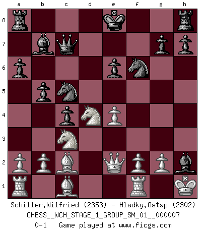 Last move : 0-1 2009 December 26 22:29:45 [Event "FICGS__CHESS__WCH_STAGE_1_GROUP_SM_01__000007"] [Site "FICGS"] [Date "2009.11.02"] [Round "1"] [White "Schiller,Wilfried"] [Black "Hladky,Ostap"] [Result "0-1"] [WhiteElo "2353"] [BlackElo "2302"] 1.d4 d5 2.c4 c6 3.Nc3 Nf6 4.e3 e6 5.Nf3 Nbd7 6.Bd3 dxc4 7.Bxc4 b5 8.Bd3 Bb7 9.O-O a6 10.e4 c5 11.d5 Qc7 12.dxe6 fxe6 13.Bc2 c4 14.Qe2 Bd6 15.Nd4 Bxh2+ 16.Kh1 Nc5 0-1 QGD Slav defense Kingside Castling by player White (move 9) Player Black won this chess game. Follow this game move after move (download)Chess problems demand from the composer the same virtues that characterize all worthwhile art: originality, invention, conciseness, harmony, complexity, and splendid insincerity. (Vladimir Nabokov) Zu meiner Zeit war ein 20 jähriger ein junger Spieler, heute ist er ein Veteran. (Garry Kasparov) Aquel que ve no otra dirección en el juego que la de dar Jaque Mate a su oponente, nunca será un buen jugador de Ajedrez. (Euwe) La conception d'un plan est le processus par lequel un joueur exploite les avantages de sa position tout en s'efforçant d'en réduire au minimum les inconvénients. Afin de garantir le succès, un plan doit toujours se fonder sur un diagnostic objectif des particularités d'une position. La conception d'un plan est d'autant plus difficile que la position est équilibrée, et grandement facilitée lorsqu'il n'existe qu'un seul plan susceptible de répondre aux exigences de la position. (Harry Golombek) If I had no sense of humor, I would long ago have committed suicide. (Mahatma Gandhi)