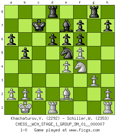 Last move : 1-0 2009 December 23 21:43:35 [Event "FICGS__CHESS__WCH_STAGE_1_GROUP_SM_01__000007"] [Site "FICGS"] [Date "2009.11.02"] [Round "1"] [White "Khachaturov,Vadim"] [Black "Schiller,Wilfried"] [Result "1-0"] [WhiteElo "2292"] [BlackElo "2353"] 1.e4 c5 2.Nf3 Nc6 3.d4 cxd4 4.Nxd4 Nf6 5.Nc3 d6 6.Bg5 Qb6 7.Nb3 a6 8.Qd2 e6 9.O-O-O Be7 10.Na4 Qc7 11.Bxf6 gxf6 12.Qe3 b5 13.Nb6 Rb8 14.Nxc8 Rxc8 15.Kb1 Qa7 16.Qxa7 Nxa7 17.Be2 Kd7 18.f4 Rhg8 19.g3 Kc7 20.Nc1 Nc6 21.Nd3 Rcd8 22.f5 Ne5 23.Nf4 1-0 Sicilian defense Queenside Castling by player White (move 9) Player White won this chess game. Follow this game move after move (download)It began to feel as though you were playing against Chess itself. - On playing against Robert Fischer. (Walter Shipman) Wie, soll nun auch die Opposition abgeschafft werden? Ja, es tut mir leid, Ihnen diesen Schmerz nicht ersparen zu können. (Aaron Nimzowitsch) Me siento como si fuera una pieza en una partida de Ajedrez, cuando mi oponente me indica: esa pieza no puede ser movida. (Soren Kierkegaard) Le moment que je préfère le plus dans une rencontre, c'est celui où je sens que la personnalité de l'adversaire se brise. (Robert Fischer) Be who you are, and say what you feel because those who mind don't matter, and those who matter don't mind. (Dr Seuss)