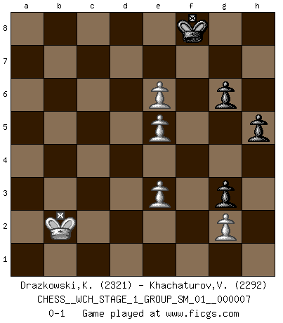 Last move : 0-1 2010 May 6 16:16:56 [Event "FICGS__CHESS__WCH_STAGE_1_GROUP_SM_01__000007"] [Site "FICGS"] [Date "2009.11.02"] [Round "1"] [White "Drazkowski,Krzysztof"] [Black "Khachaturov,Vadim"] [Result "0-1"] [WhiteElo "2321"] [BlackElo "2292"] 1.d4 Nf6 2.c4 e6 3.Nf3 b6 4.Nc3 Bb7 5.a3 d5 6.cxd5 Nxd5 7.Qc2 Nxc3 8.bxc3 Nd7 9.e4 c5 10.Bd3 Qc7 11.Qb1 Bd6 12.O-O h6 13.a4 O-O 14.e5 Be7 15.Bh7+ Kh8 16.Be4 Rac8 17.Be3 Rfd8 18.Rc1 Nb8 19.Bxb7 Qxb7 20.h3 cxd4 21.cxd4 Rxc1+ 22.Qxc1 Rc8 23.Qd2 Kg8 24.Qe2 Nc6 25.Nd2 Nb4 26.Qg4 Kf8 27.Ne4 Nd5 28.Ng3 Nxe3 29.fxe3 Bg5 30.Ra3 Qe7 31.Rb3 Qc7 32.Qd1 Qc4 33.Rd3 Qd5 34.Kh2 Kg8 35.Nh5 Qa2 36.Nf4 Rc2 37.Qf3 Qxa4 38.Qa8+ Kh7 39.Qe4+ g6 40.h4 Bxf4+ 41.Qxf4 Rc7 42.h5 g5 43.Qe4+ Kg7 44.Qf3 Qc4 45.Rd2 b5 46.Qf6+ Kh7 47.Qd8 Rb7 48.Rf2 Qc7 49.Qf8 Qe7 50.Qc8 Kg7 51.Rc2 a5 52.Rc5 a4 53.Qa8 Rc7 54.Rxb5 g4 55.Kg3 Qg5 56.Qe4 Rc3 57.Kf2 Rb3 58.Rxb3 g3+ 59.Ke1 axb3 60.d5 b2 61.dxe6 Qxh5 62.Kd2 Qg6 63.Qxg6+ fxg6 64.Kc2 Kf8 65.Kxb2 h5 0-1 Queen's Indian : 4.Nc3 Kingside Castling by player White (move 12) Kingside Castling by player Black (move 13) 10 pieces endgame at move 63 : White KPPPP , Black KPPPP WHITE : King + 4 Pawns BLACK : King + 4 Pawns 9 pieces endgame at move 65 : White KPPPP , Black KPPP WHITE : King + 4 Pawns BLACK : King + 3 Pawns Player Black won this chess game. Follow this game move after move (download)Half the variations which are calculated in a tournament game turn out to be completely superfluous. Unfortunately, no one knows in advance which half. (Jan Tinman) Wenn Du absolut nicht mehr weißt, was Du tun sollst, dann ist es Zeit für Panik. (John van der Wiel) Siempre es mucho mejor sacrificar las piezas de tu oponente. (Savielly Tartakover) Il n'y a pas de prix trop élevé au scalp de l'ennemi. (Koblentz) To send light into the darkness of men's hearts - such is the duty of the artist. (Schumann)